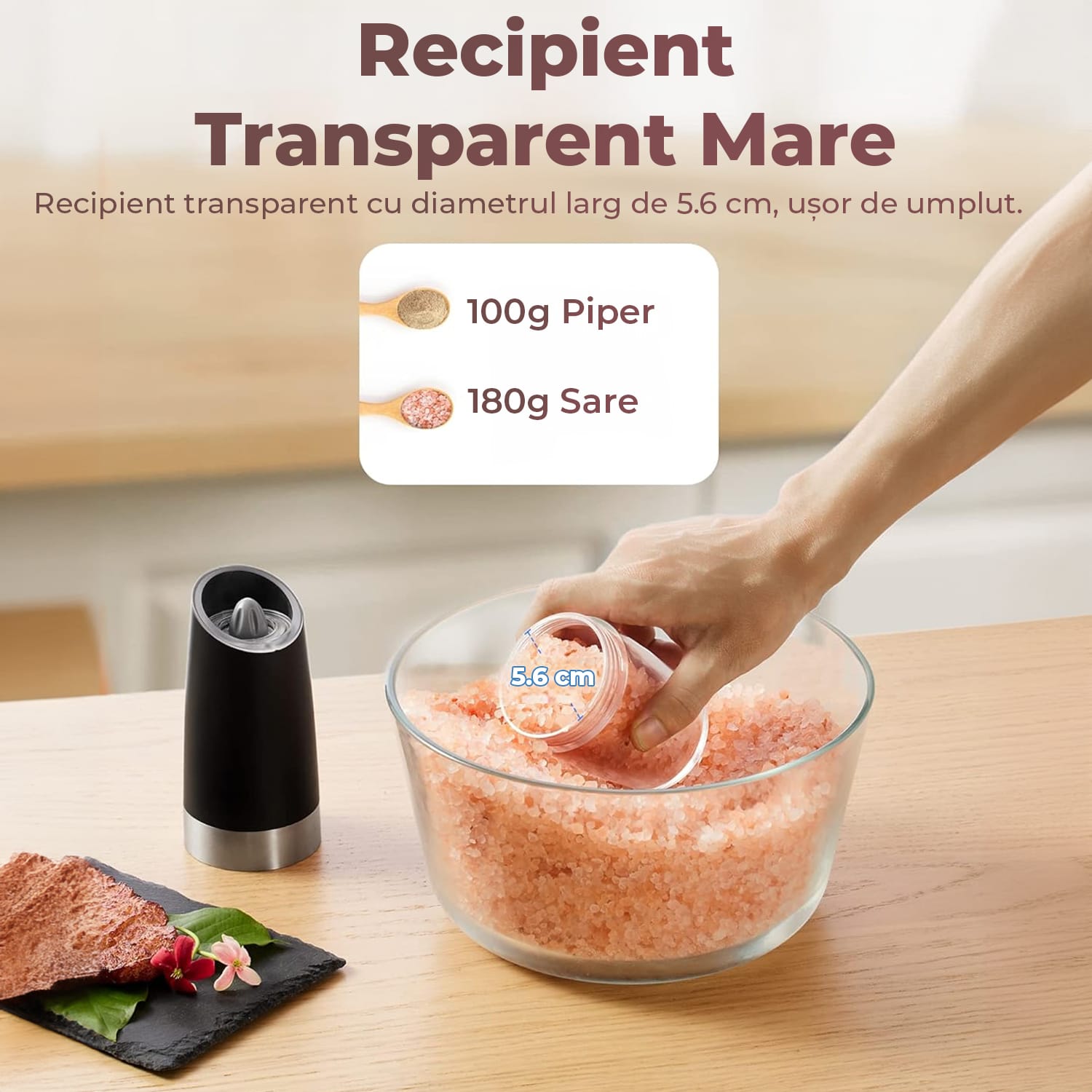 Capacitate mare îmbunătățită: râșnițele electrice Sangcon pentru sare și piper au o capacitate îmbunătățită de 184 g pentru sare grunjoasă și 100 g pentru piper alb, perfecte pentru a fi depozitate ca set drăguț de sare și piper. Rezervorul pentru condimente este fabricat din acrilic transparent alimentar, ușor de văzut. Recipientul pentru condimente este separat de motor și dozator, ceea ce îl face foarte ușor de curățat. Deschiderea extra-largă a recipientului de 2,3 inchi permite o reumplere ușoară.