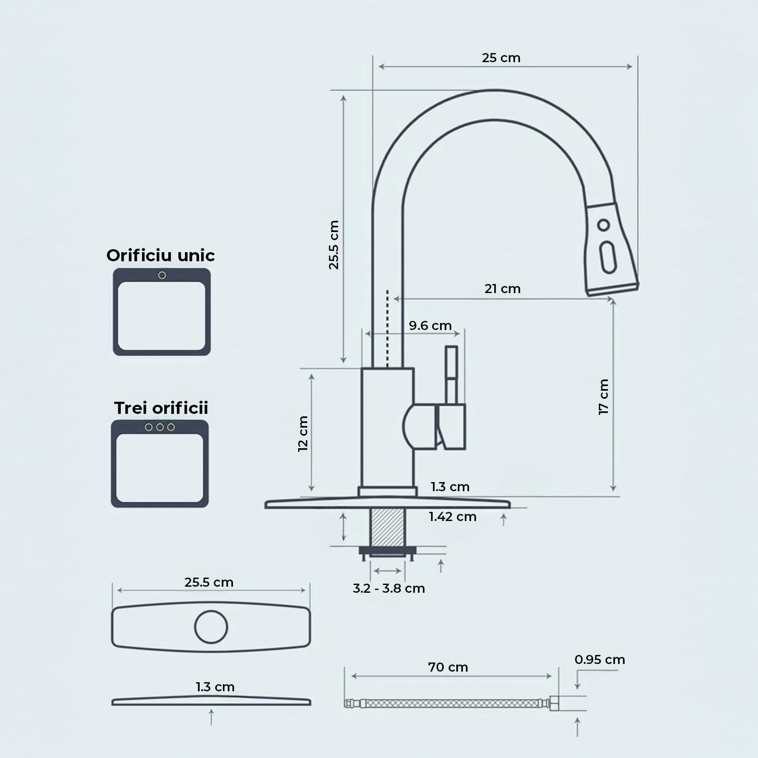 Cu trei moduri de pulverizare – Stream (jet continuu), Spray (pulverizare puternica) si Pause (oprire instantanee) – acest robinet ofera flexibilitate maxima, adaptandu-se oricarei activitati din bucatarie. Furtunul retractabil de 45 cm si capul de pulverizare rotativ la 360° asigura acoperire completa a chiuvetei, iar manerul unic permite control precis asupra debitului si temperaturii apei.