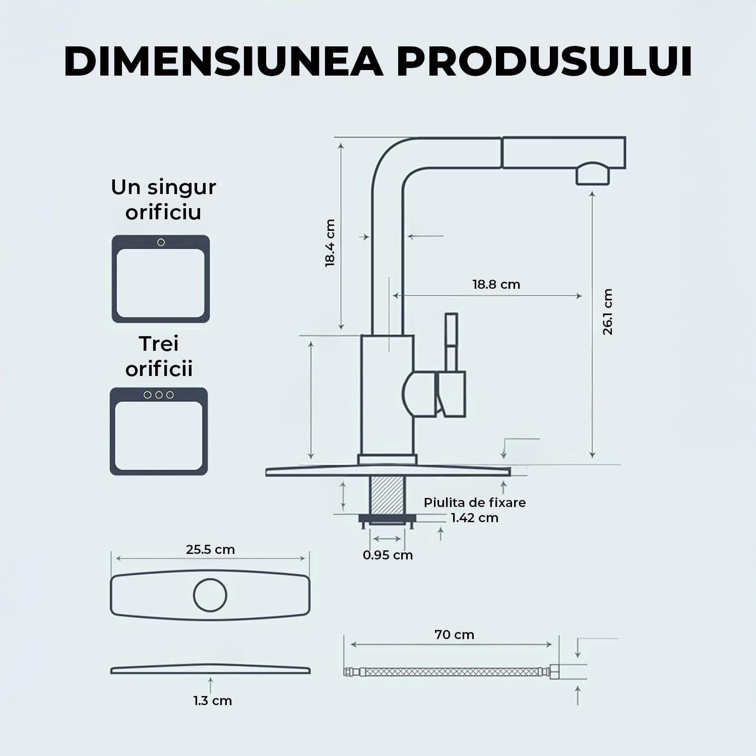 Cu un design modern in forma de L, acest robinet aduce un plus de eleganta oricarei bucatarii, punand in valoare liniile drepte si minimaliste. Furtunul retractabil de 45 cm si pulverizatorul cu rotatie 360° ofera flexibilitate maxima, permitandu-ti sa ajungi in orice colt al chiuvetei cu usurinta.