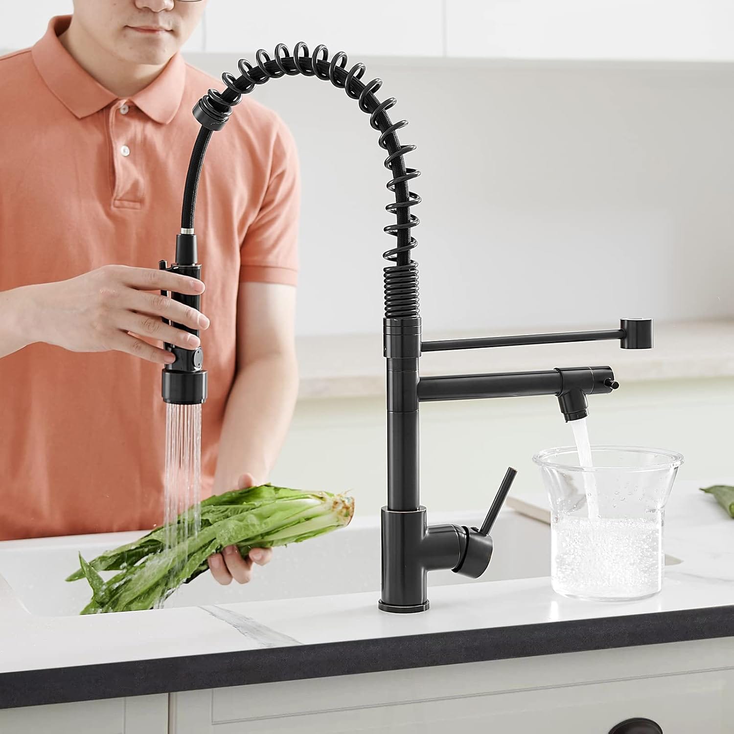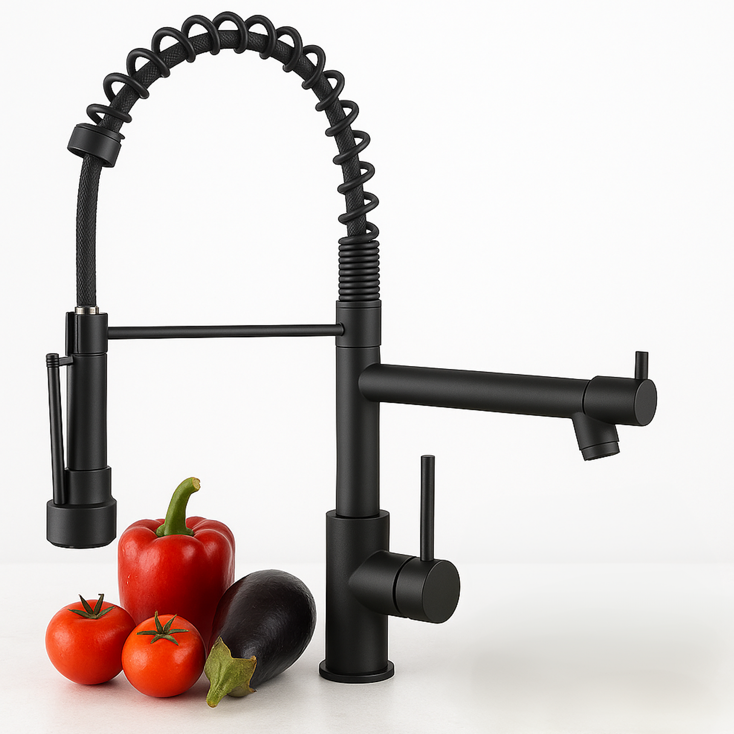 Adauga un plus de stil in bucataria ta cu aceasta baterie de chiuveta, care include o functie retractabila si un brat cu rotatie de 360 de grade. La fel ca multe alte baterii de chiuveta prezentate, aceasta ofera o instalare rapida si simpla. Functia cu un singur maner rezista utilizarii intense datorita constructiei sale comerciale. Foloseste cu usurinta cele doua duze pentru a ajunge in toate colturile chiuvetei.