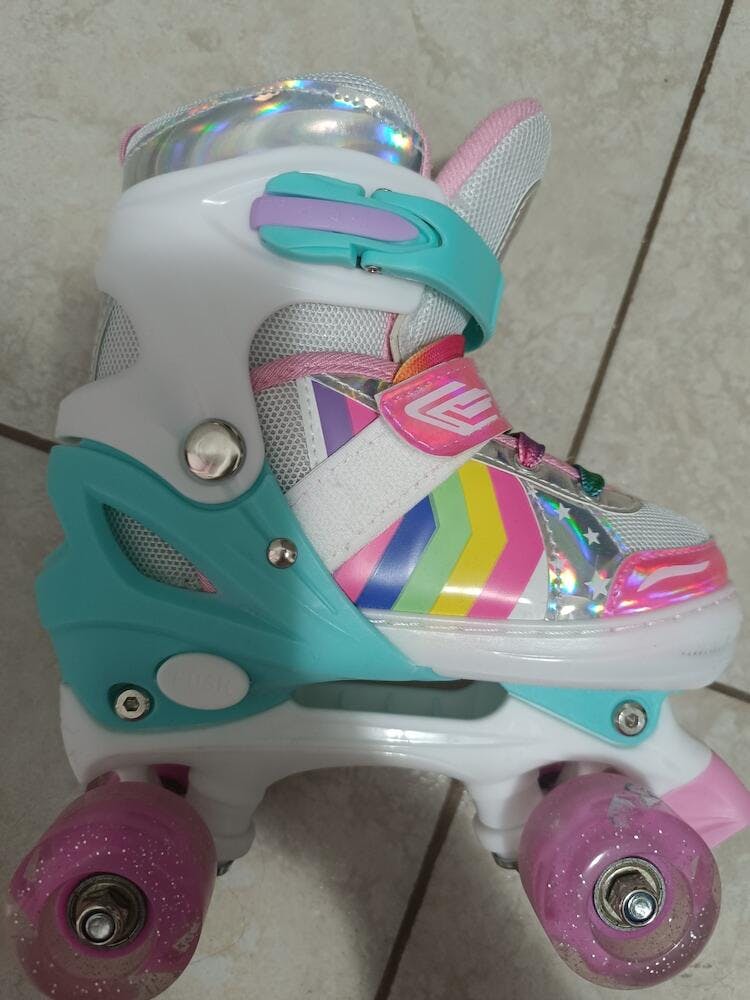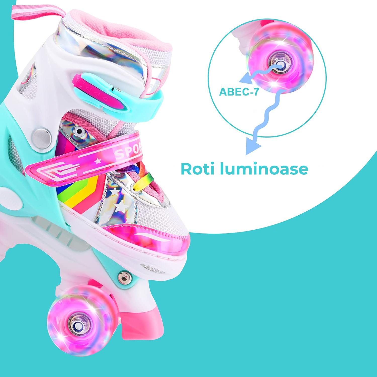 Transformă fiecare ieșire într-o aventură strălucitoare cu rolele noastre magice, concepute pentru a aduce zâmbete pe fețele celor mici! Roțile iluminate în culori curcubeu se activează în timpul mersului, oferind un spectacol de lumini la fiecare rotire și atrăgând toate privirile. Fabricate din materiale de înaltă calitate, rolele sunt dotate cu spumă EPE respirabilă, care asigură confortul și protecția piciorului pe tot parcursul zilei, prevenind disconfortul și oferind stabilitate.