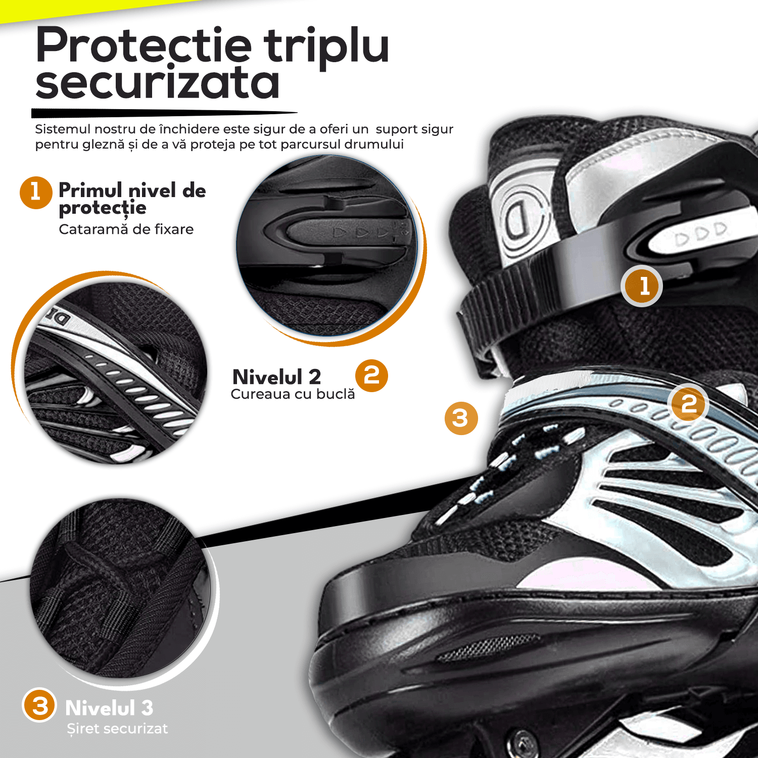 Siguranta si confortul copiilor sunt prioritatea noastra. Rolele noastre in linie reglabile sunt dotate cu un sistem de protectie tripla, inclusiv catarame cu parghie Cam, curea si sireturi. Cadrul din aliaj de aluminiu ofera suport sigur pentru glezna, iar cizma interioara este respirabila.