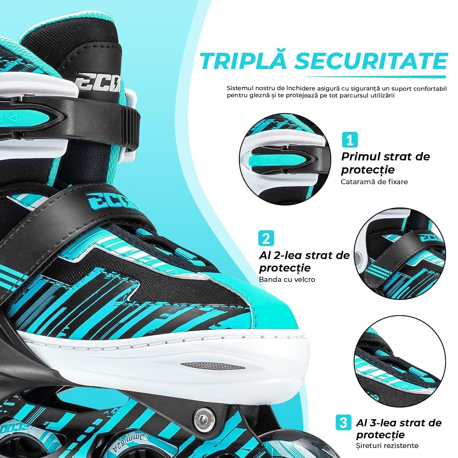 Sistem de inchidere sigur:  Sireturile rotunde rezistente sunt elastice pentru a asigura flexibilitate fara a se desface. Catarama practica de blocare, care poate fi deschisa cu un singur buton, fixeaza ferm rolele pe glezna. Apasati butonul de pe cealalta parte a catramei pentru a regla cu precizie strangerea si utilizati catarama pentru a regla si fixa corpul pantofului, oferind o acoperire sigura, usor de pus si de scos si care se potriveste piciorului pentru a oferi siguranta.