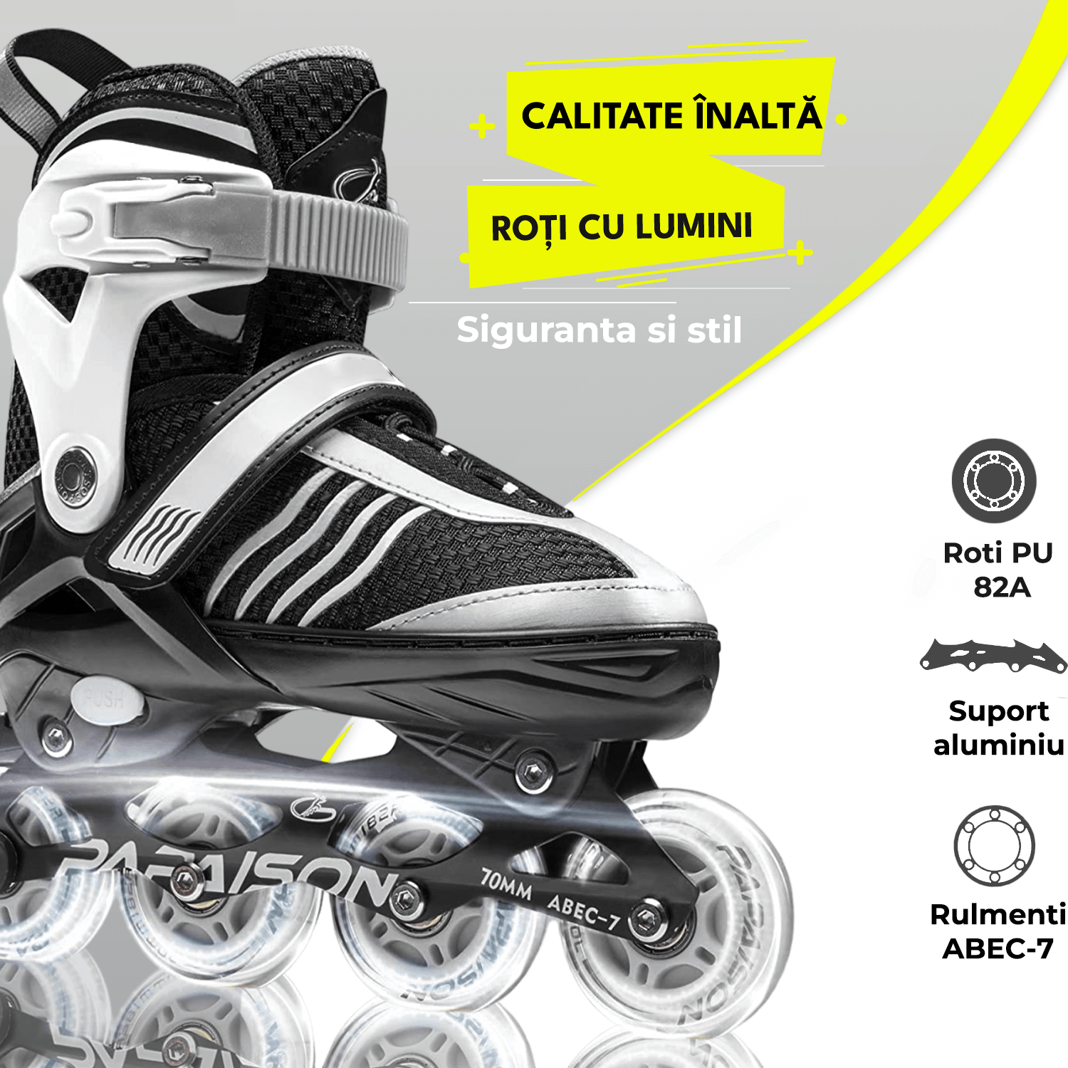 Role Reglabile M 32-35, Roți Luminoase Silicon, Rulmenți ABEC-7, Gri