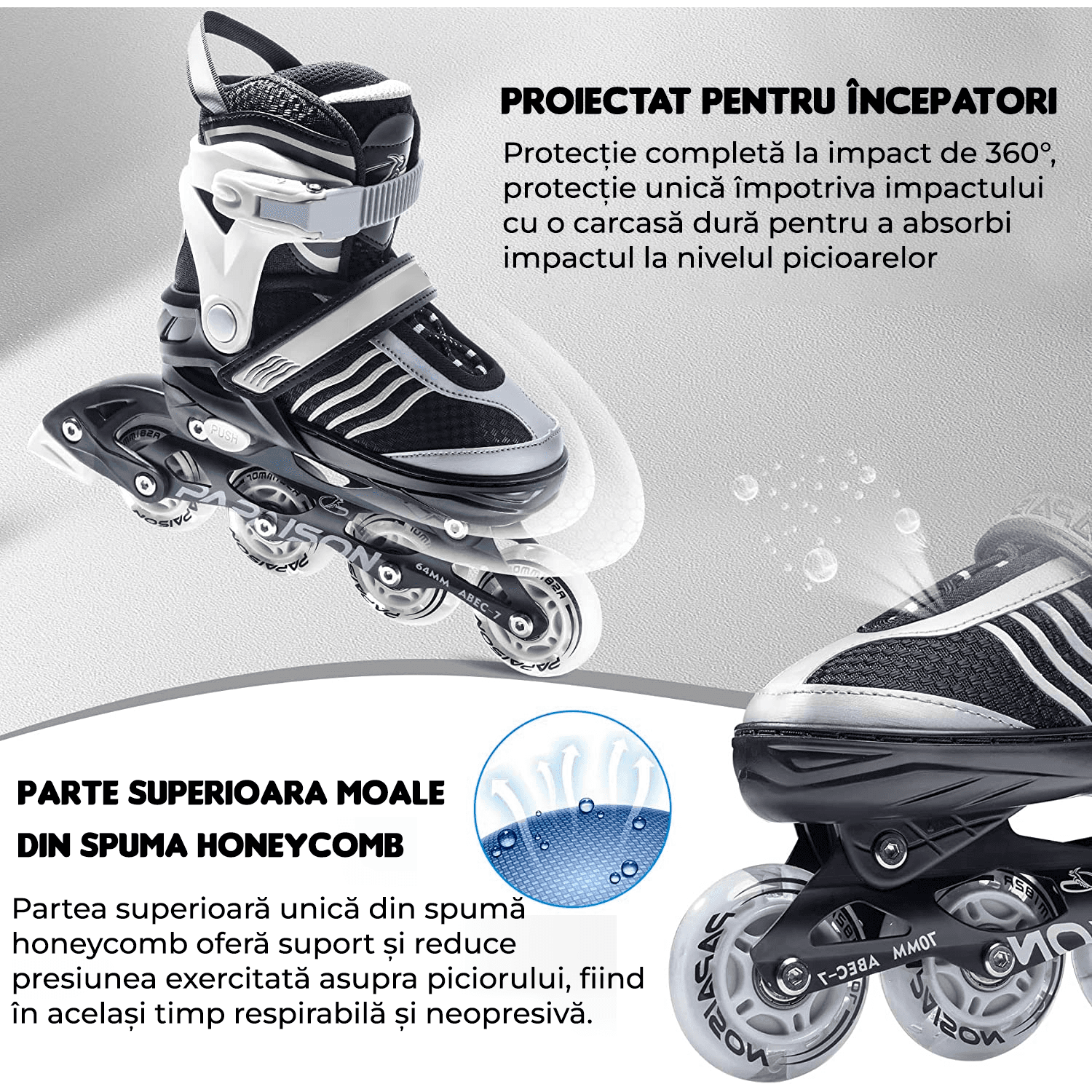 Rolele in linie Elindor sunt realizate cu materiale de inalta calitate, inclusiv un cadru din aluminiu armat, roti netede de 82A PU si rulmenti ABEC-7 de inalta calitate. Acest design ofera o experienta lina si confortabila la fiecare utilizare, cu un varf gros anti-impact si un interior confortabil si moale in pantofii rolelor.