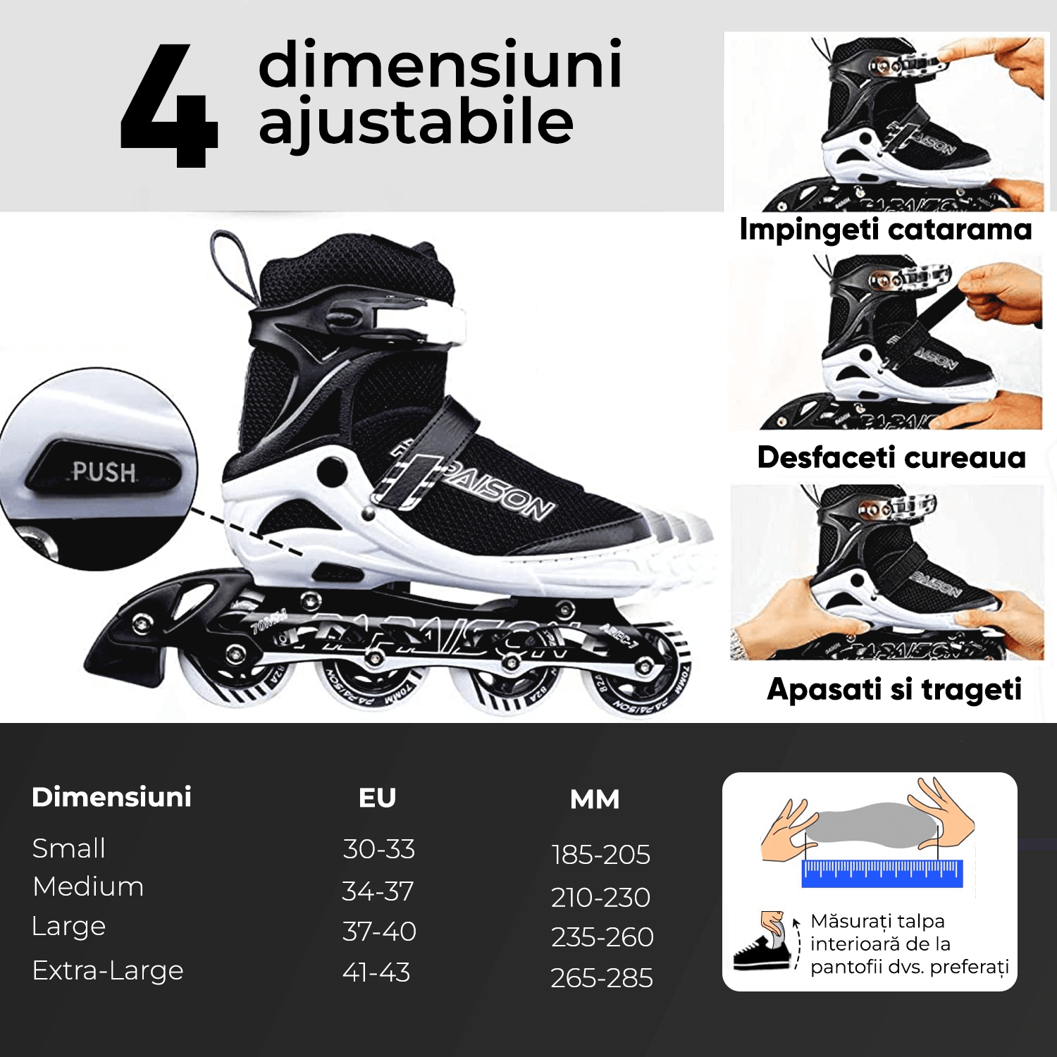 √ROLE INLINE REGLABILE - (Vă rugăm să confirmați mărimea inainte de a plasa comanda). Rolele noastre inline au 3 dimensiuni diferite unisex, S/M/L, și fiecare mărime este reglabilă. Vă rugăm să vă asigurați că alegeți mărimea corectă verificand diagramele de mărimi incluse. Și nu uitați să ajustați lungimea bocancului folosind butonul de declanșare inainte de a le purta, veți constata cat de convenabil este de operat și copiii și tinerii se pot bucura de ele mulți ani, chiar și atunci cand picioarele le cresc.