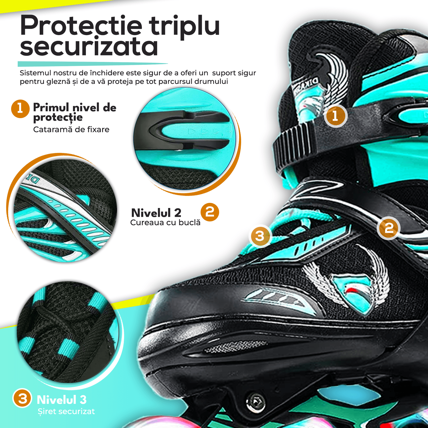 Siguranța și confortul copiilor sunt prioritatea noastră. Rolele noastre in linie reglabile sunt dotate cu un sistem de protecție triplă, inclusiv catarame cu parghie Cam, curea și șireturi. Cadrul din aliaj de aluminiu oferă suport sigur pentru gleznă, iar cizma interioară este respirabilă.