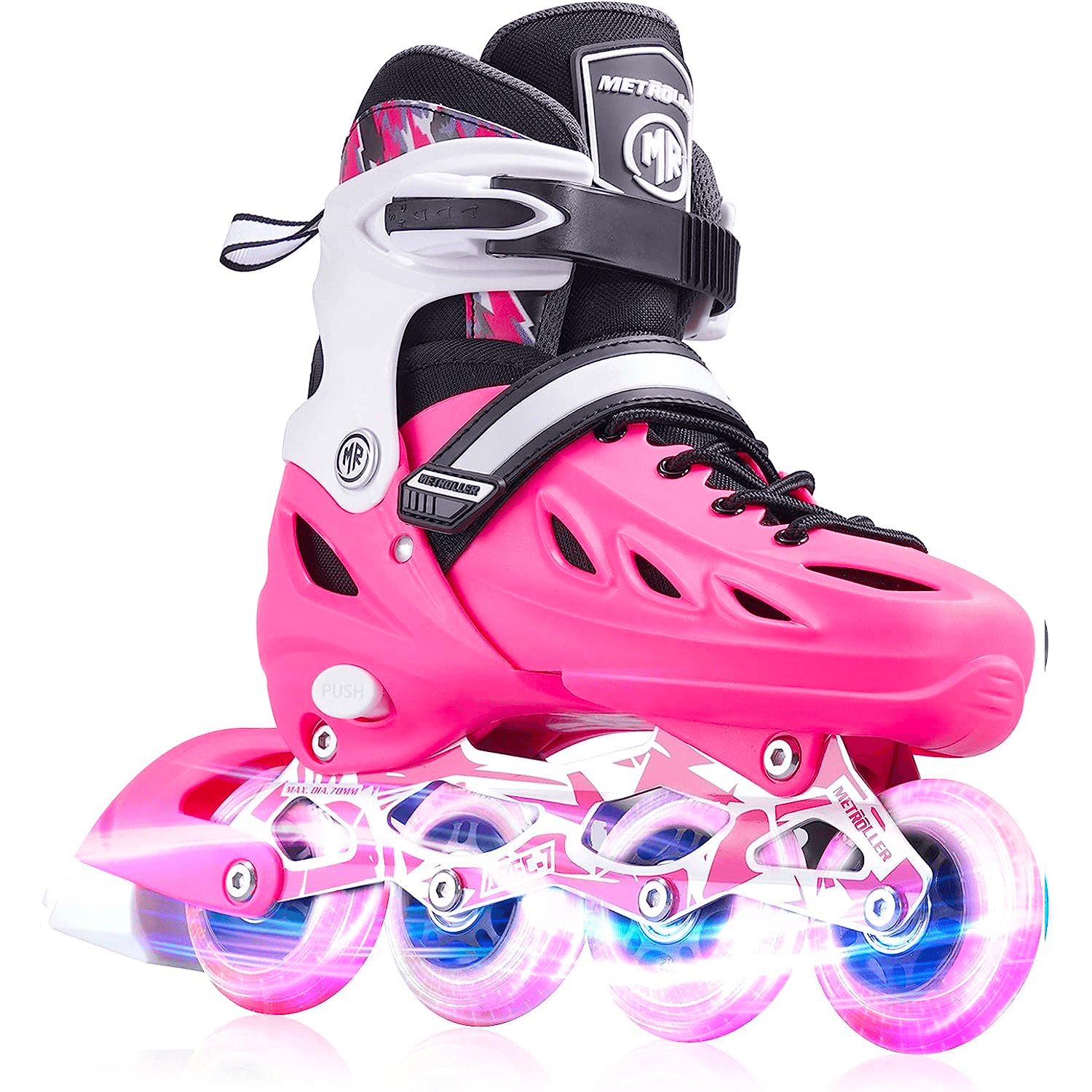 Role in Linie Reglabile - Rolele noastre in linie vin in 3 dimensiuni diferite unisex, perfecte pentru picioare in crestere. Cu un singur buton, puteti ajusta usor dimensiunea patinelor in trei marimi diferite - S / M / L . (Te rugam sa te asiguri ca alegi dimensiunea corecta verificand tabelul de marimi) Foloseste butonul pentru a schimba lungimea rolelor inainte de a le purta, vei descoperi ca sunt foarte usor de pus si de ajustat. Toata lumea poate gasi marimea perfecta pentru ei, iar copiii si tinerii le pot folosi pentru multi ani. 8 Roti Luminate - Rolele in linie sunt echipate cu 8 roti care se lumineaza, toate rotile stralucind si oferind un spectacol de culori ca un curcubeu atunci cand copilul tau incepe sa se dea cu rolele. Luminitele sunt alimentate de rotatia rotilor si nu au nevoie de inlocuirea bateriilor! Protectie Tripla de Siguranta - Catarama de siguranta, curea de putere si sistemul de inchidere cu sireturi ajuta la fixarea corecta a picioarelor in role si creeaza un efect suplimentar de invelire atunci cand folosesti rolele noastre in linie pentru copii. Franele imbunatatite echipate pe role te ajuta sa franezi atunci cand este nevoie si ajuta de asemenea la prevenirea coliziunilor cu alti patinatori. Confort si Durabilitate - Rolele in linie sunt special concepute pentru incepatori! Bucura-te de o alunecare lina, linistita si increzatoare pe cadru din aluminiu intarit, roti din poliuretan 82A si rulmenti de inalta calitate ABEC-7. Cel Mai Bun Cadou pentru Copii, Adulti si Adolescenti - Patinajul este o abilitate de viata si o activitate sanatoasa pentru toate varstele! E perfect pentru oricine doreste sa ramana sanatos si activ! Aceste role sunt cadoul perfect pentru copii, adulti si adolescenti. Daca nu esti multumit de produs in orice moment, si ne spui ce crezi, orice intrebare sau problema va fi raspunsa si rezolvata frumos si prompt.