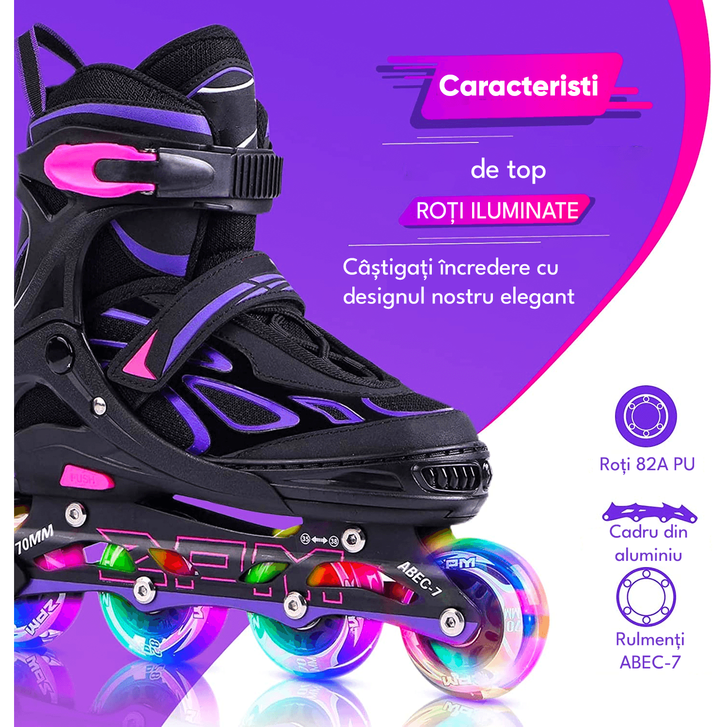 Role Reglabile S 29-32, Roți Luminoase Silicon, Rulmenți ABEC-7, Mov