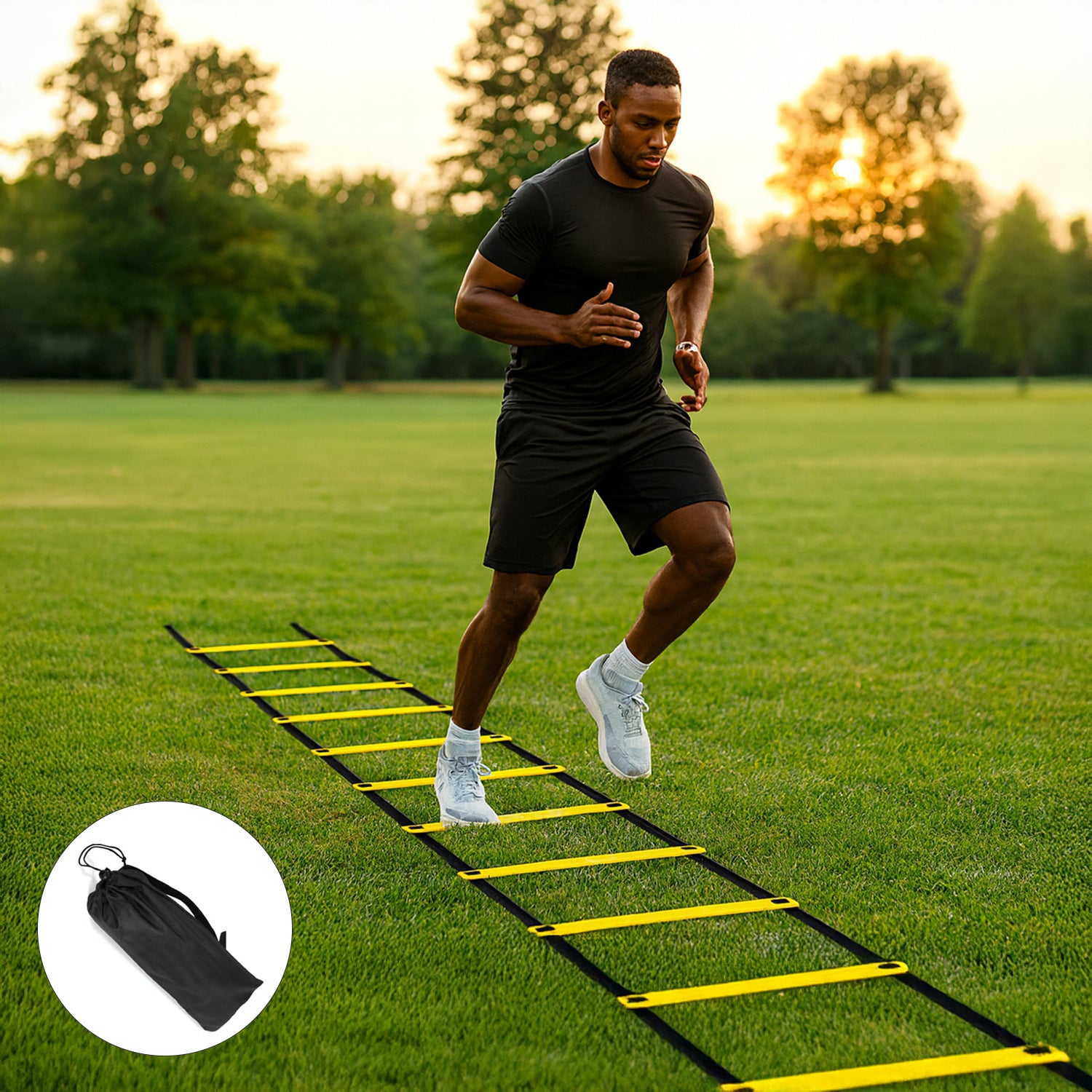 Fiecare treapta are 42 cm lungime, iar distanta dintre trepte poate fi reglata pana la 38 cm, astfel incat sa-ti personalizezi antrenamentul in functie de nevoi – fie pe iarba, fie pe teren de sport.
