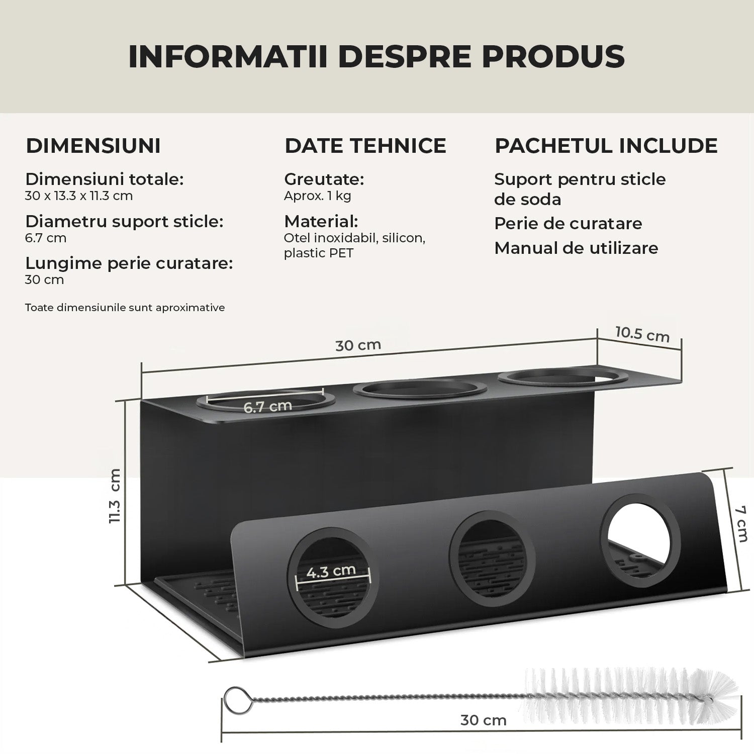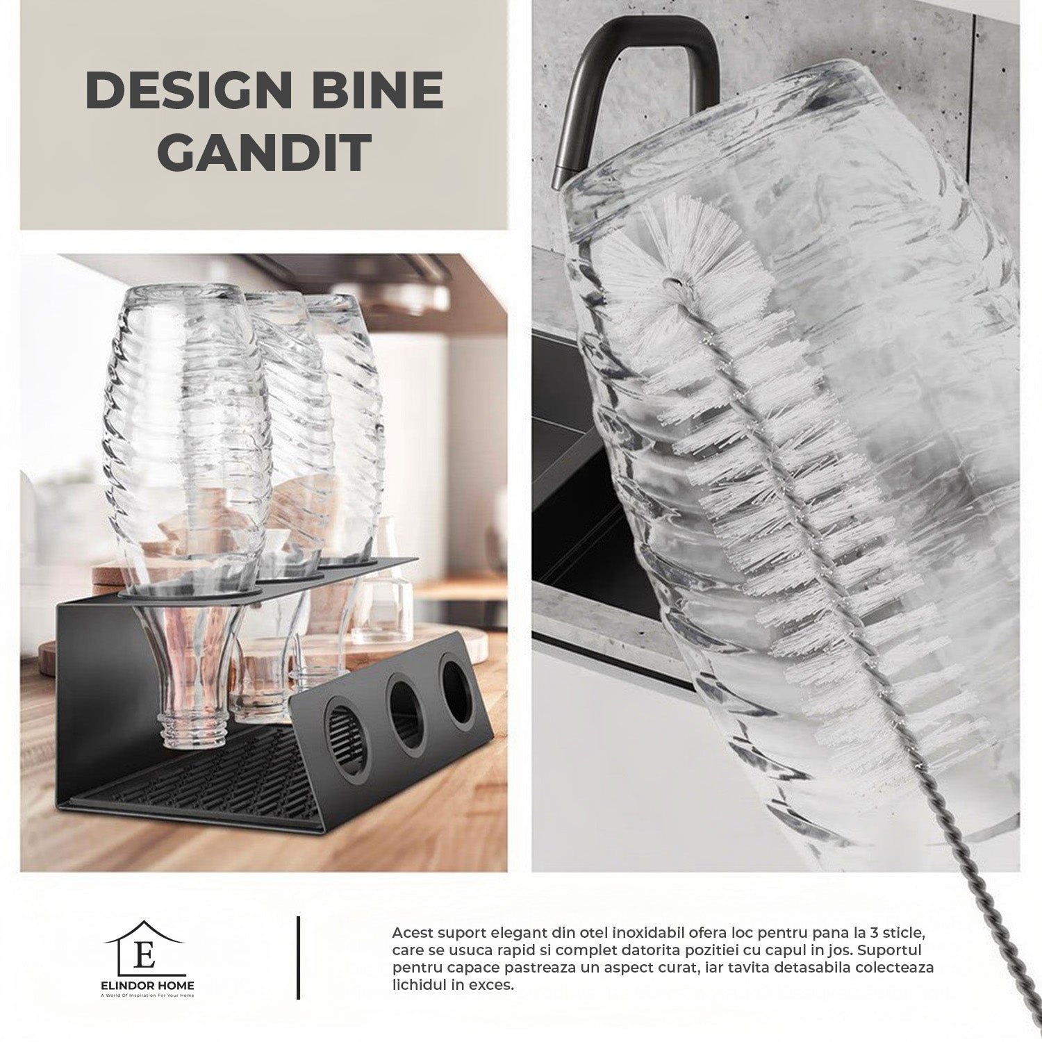 suport sticle Sodastream, uscator sticle Emil, suport capace Sodastream, uscator sticle bucatarie, suport sticle otel inoxidabil, suport 3 sticle Sodastream, tava scurgere sticle, organizator Sodastream, suport sticle Elindor®, accesorii Sodastream.