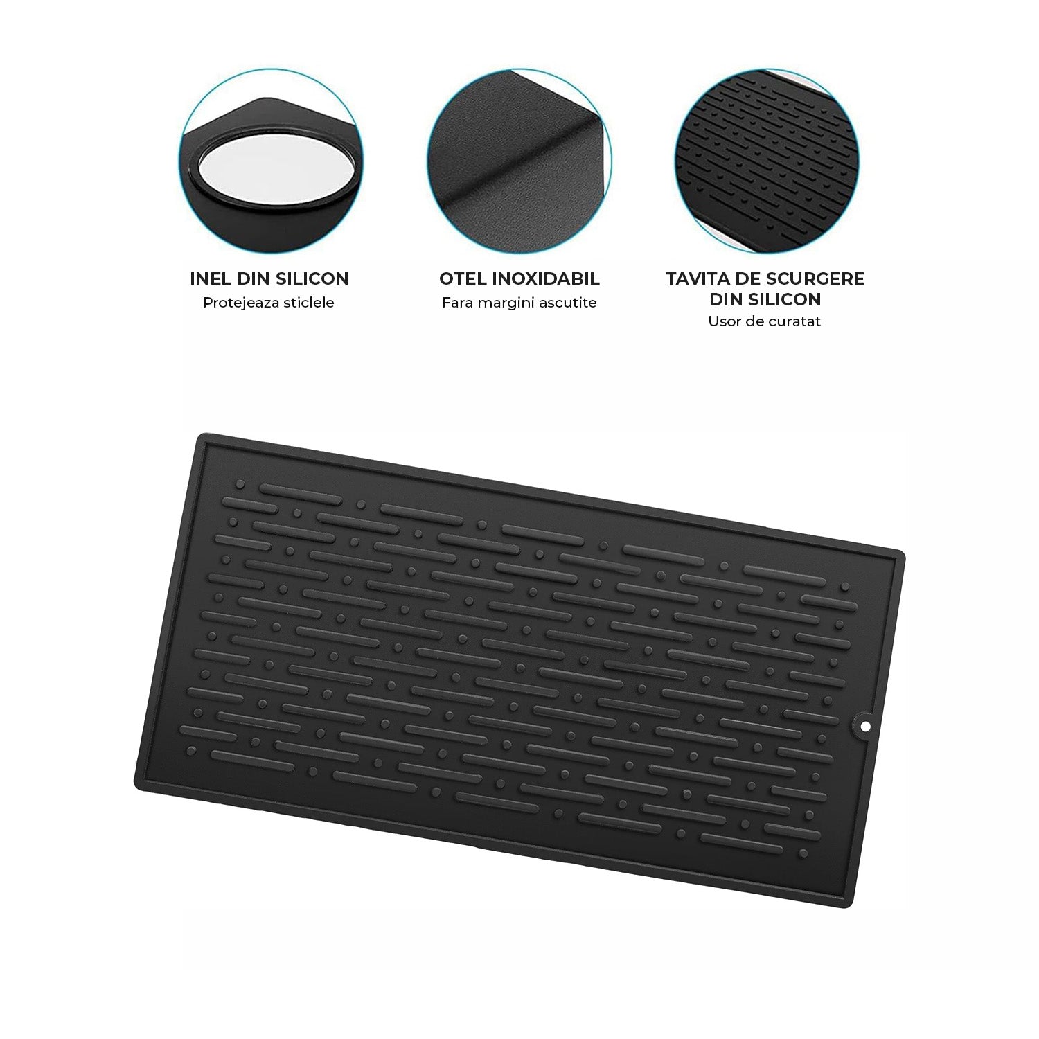 Scurgator de Sticle Elindor® cu 3 Orificii, Suport Scurgere Capace, Otel Inoxidabil, Ideal pentru Chiuveta in Bucatarie, Bar, cu Scurgere Automata si Ventilatie Completa, Multifunctional, 11.3 x 13.3 x 30 cm, Negru