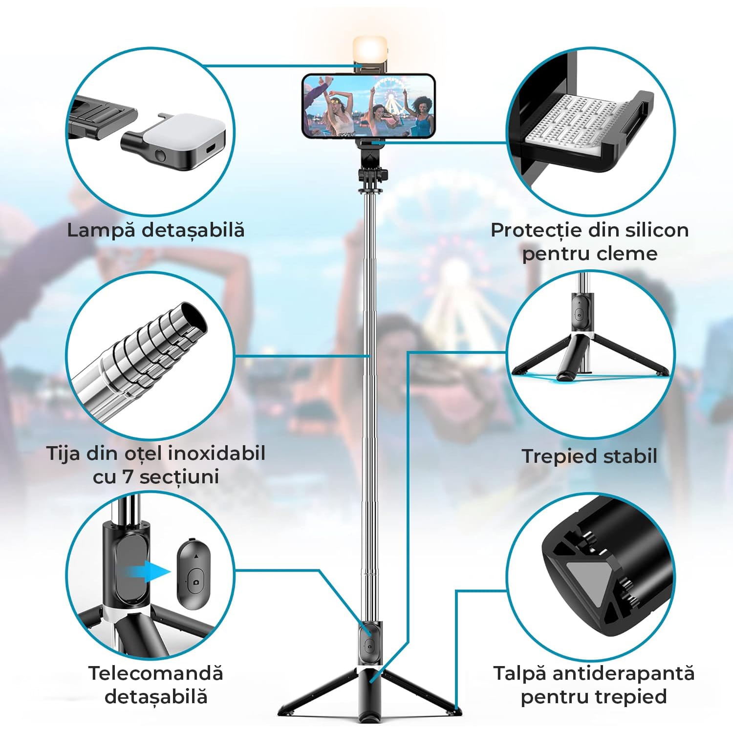Trepied Selfie Compact si Pliabil: Design compact si usor, cantareste doar 158 g, dimensiune pliata de 19.4 cm si lungime extinsa de pana la 106 cmIl puteti pune in buzunare sau genti de calatorie. Este portabil pentru a fi luat oriunde si este un accesoriu indispensabil pentru fotografiere, cum ar fi calatoriile si sporturile in aer liber, pentru a va inregistra momente minunate.