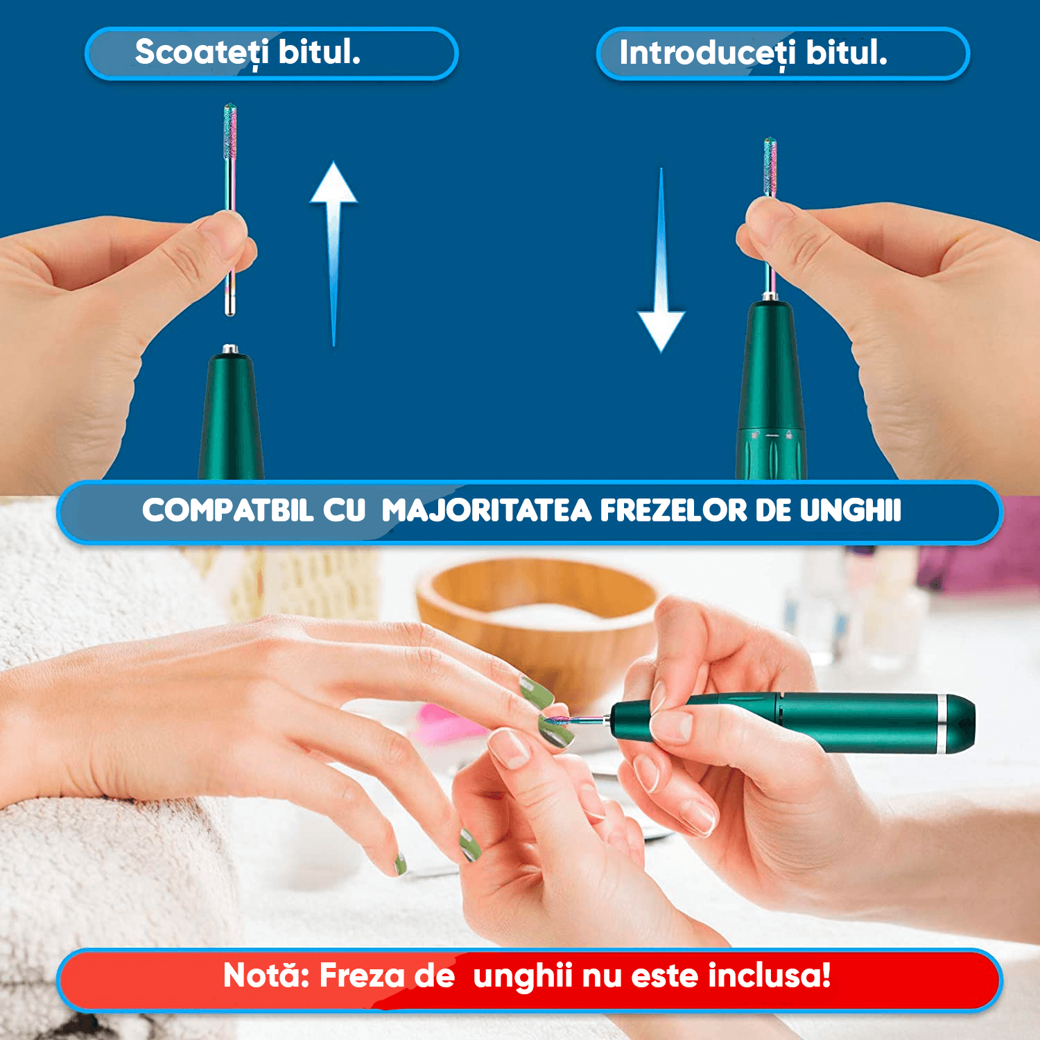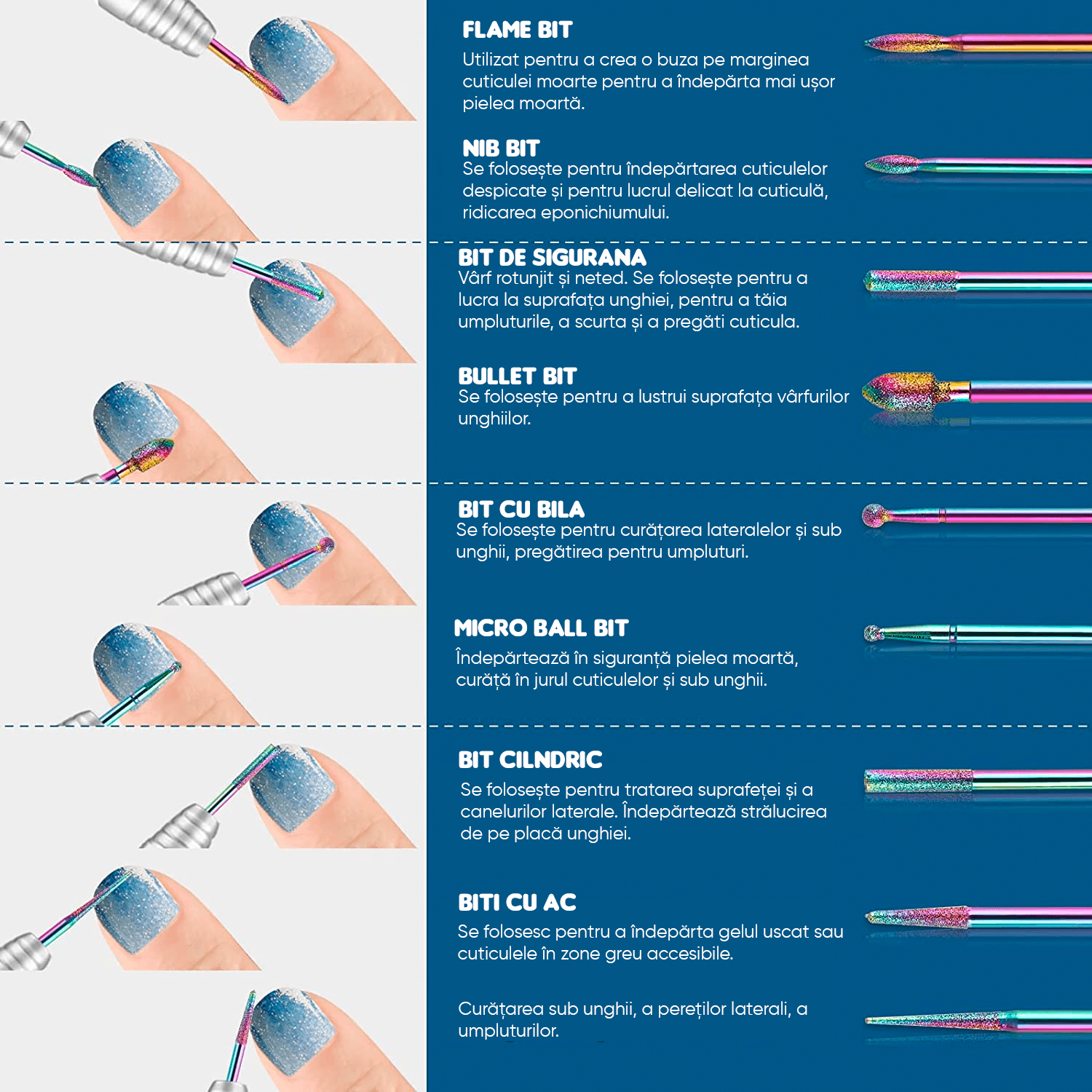 SET COMPLET: Setul de biti pentru freza de unghii cu 6 bucăți speciale pentru curățarea sub unghii, 2 bucăți in formă de bilă, 2 bucăți in formă de flacără și 1 perie, 8 bucăți de pilă pentru unghii ceramice. Potrivit atat pentru incepători, cat și pentru profesioniști.