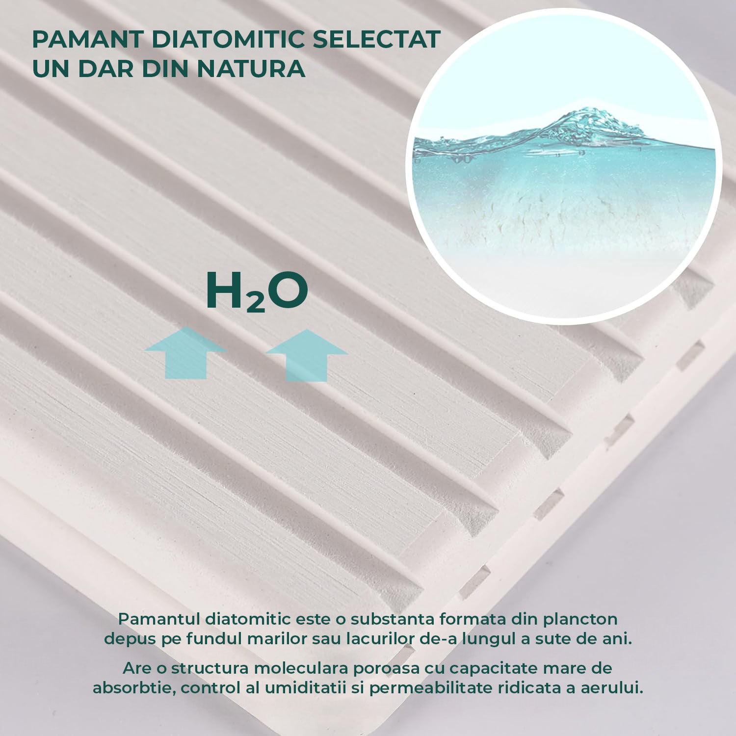 • Material natural: realizate din nămol de diatomit și fibre vegetale, cu micro-pori ce asigură absorbție rapidă a apei.