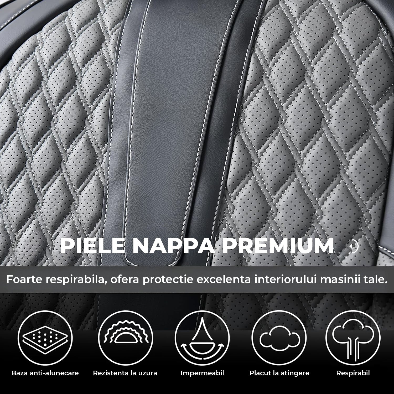 Husele sunt fabricate din piele Nappa de inalta calitate, moale la atingere si placuta la utilizare. Materialul este durabil, impermeabil si rezistent la zgarieturi, oferind in acelasi timp o elasticitate excelenta pentru confort sporit in timpul condusului. Protejeaza eficient tapiteria originala impotriva uzurii si petelor.