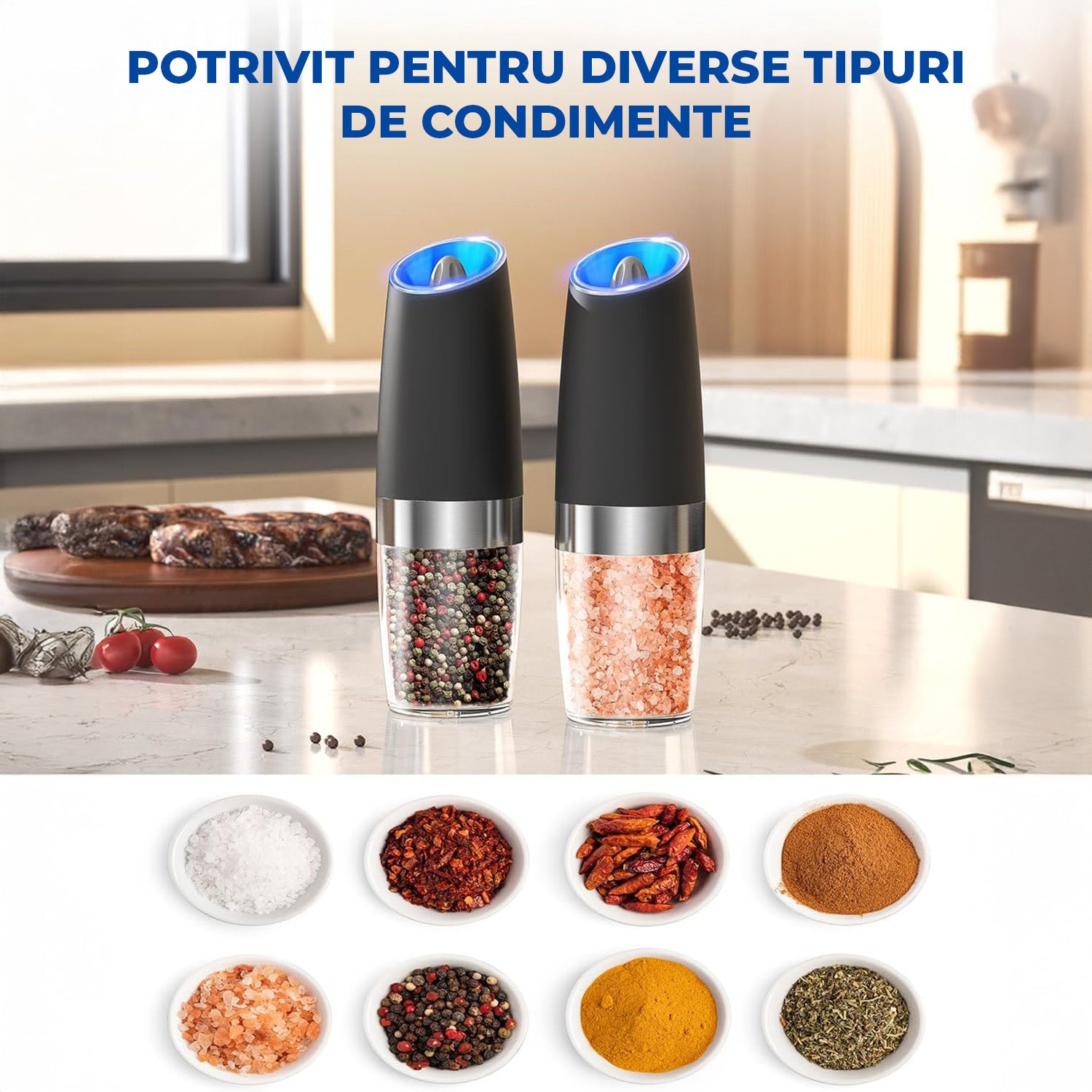 Rasnita Electrica pentru Sare si Piper, Set de 2, cu Camere de Depozitare Transparente, Reglare Grosime Macinare, LED, Senzor Gravitational, Operare cu o Mana, Negru