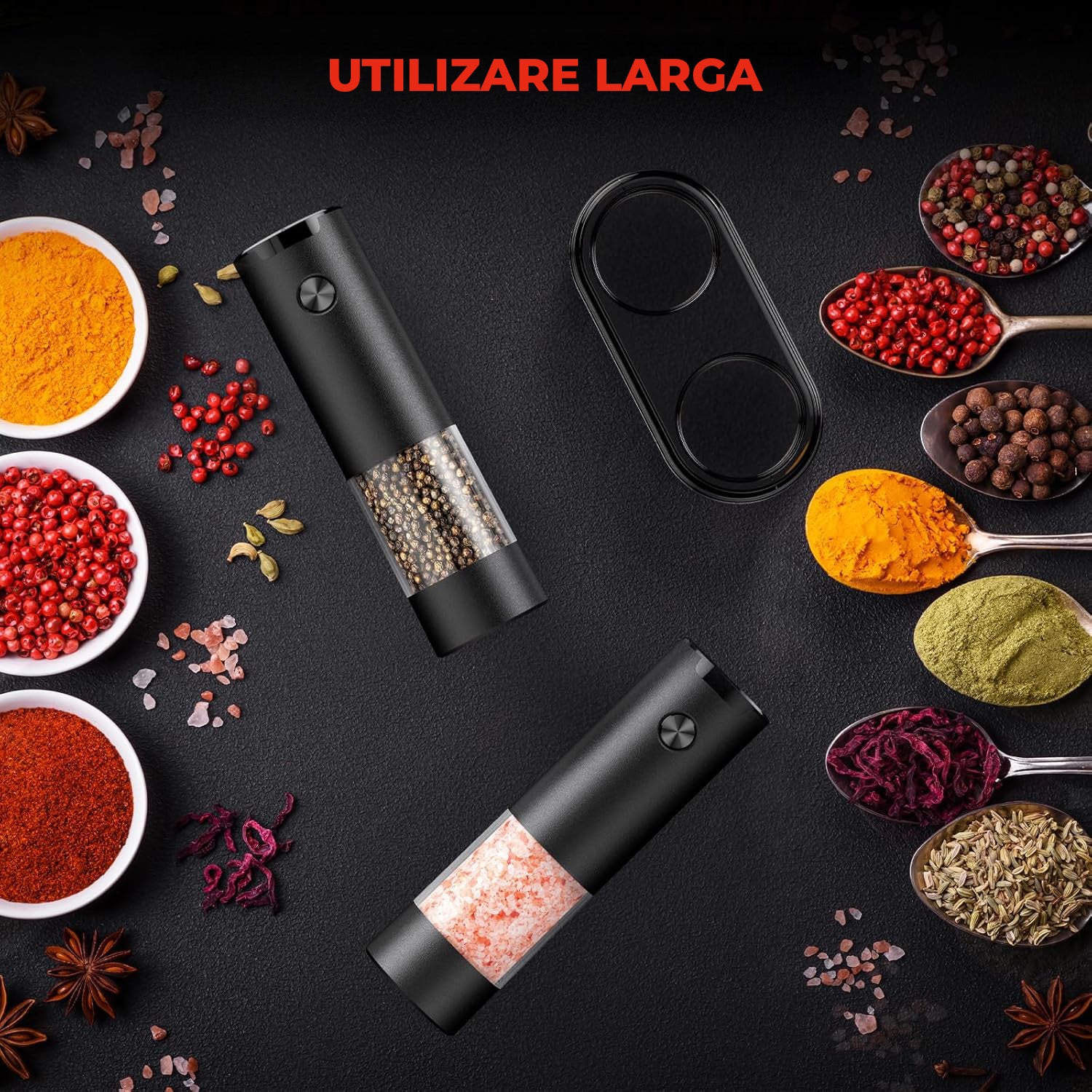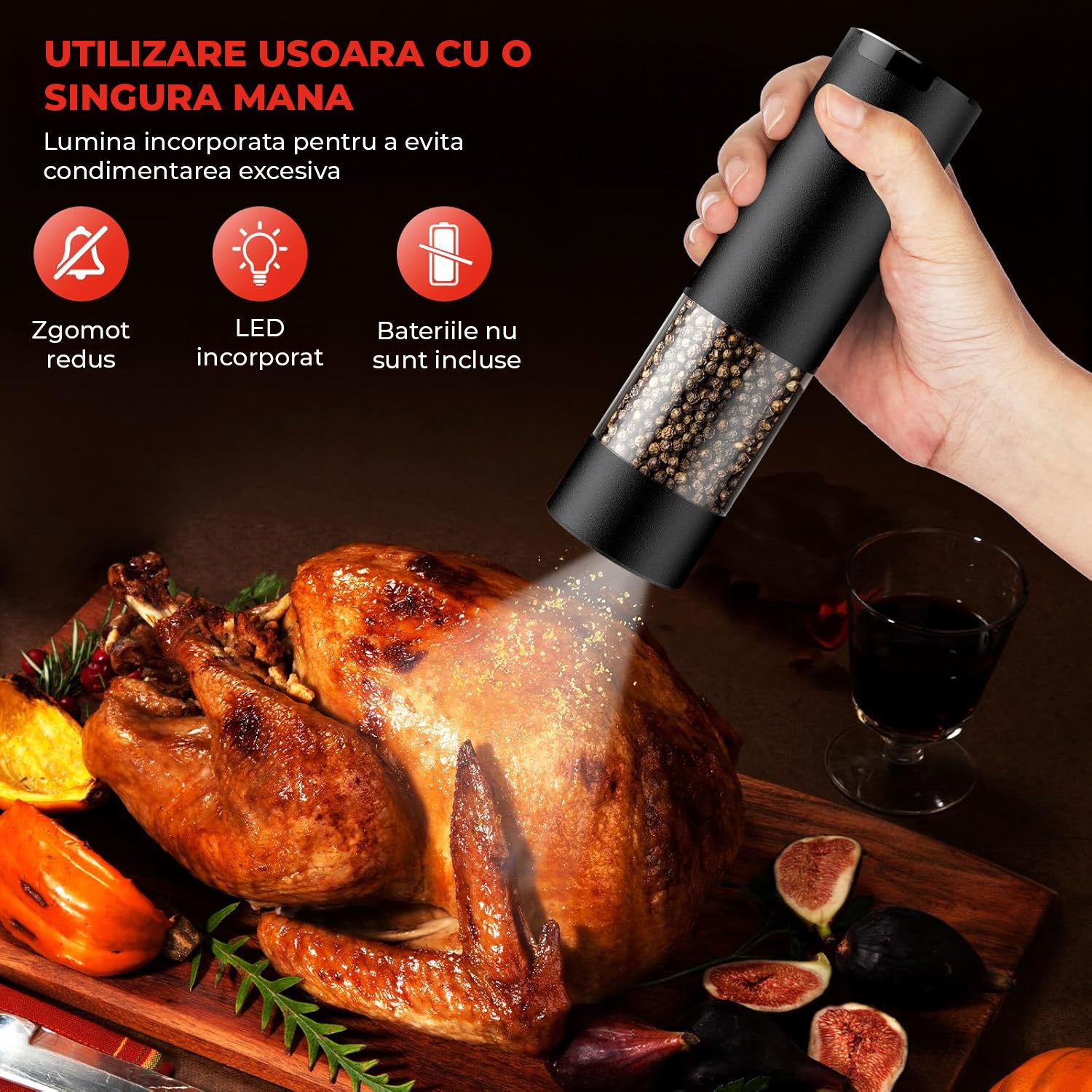 Funcționează cu 4 baterii AAA (nu sunt incluse). O simplă apăsare de buton activează râșnirea, iar eliberarea îl oprește – control deplin asupra cantității de condimente.