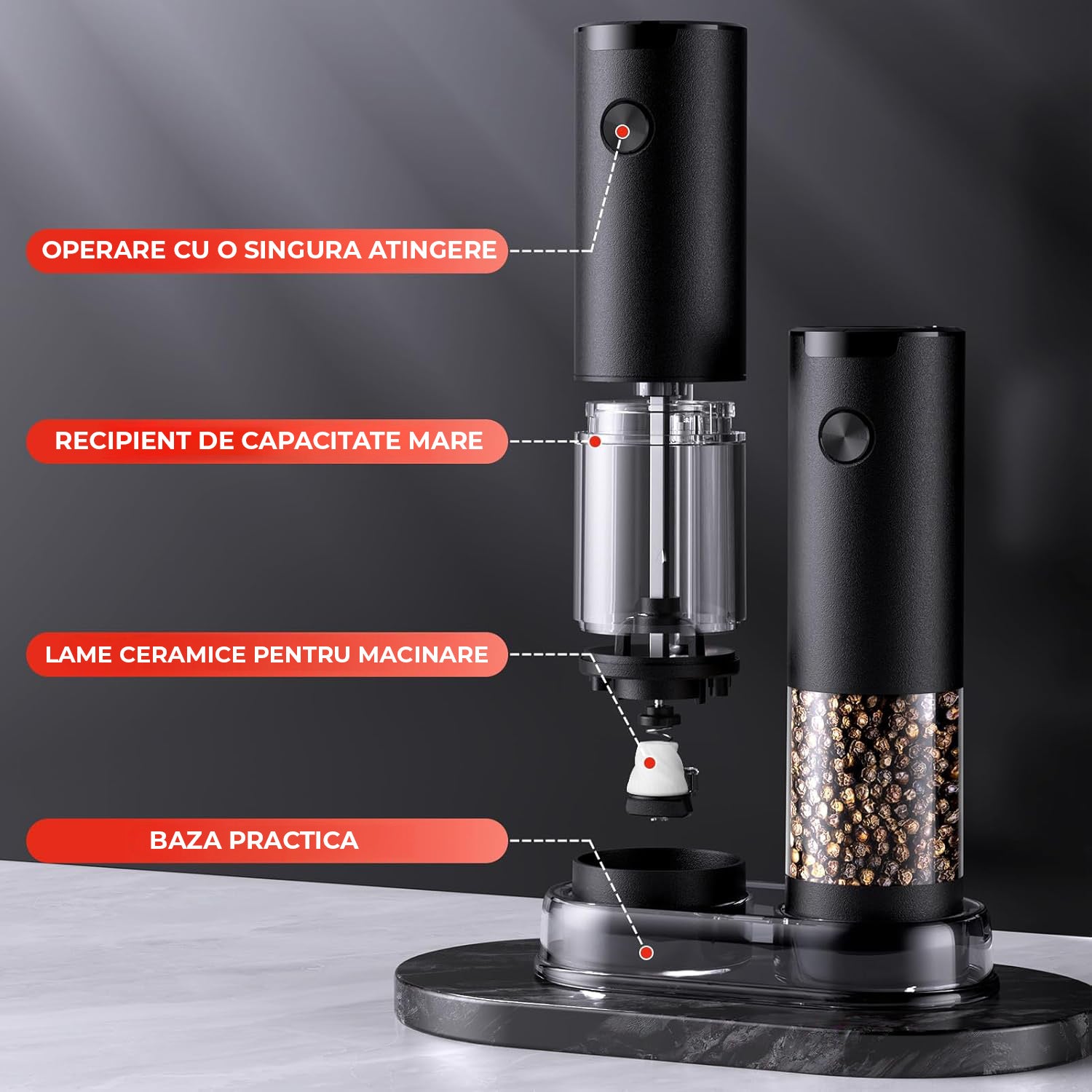 Recipientul de 360° transparent are volum mărit pentru a reduce frecvența realimentării și permite monitorizarea nivelului de sare sau piper.