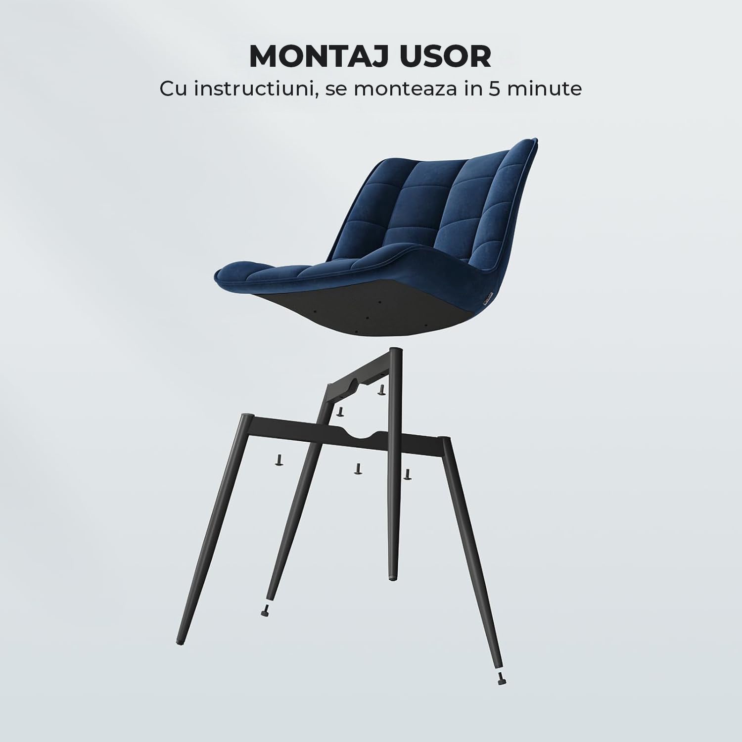 Scaunele sunt tapițate cu catifea moale și respirabilă, umplute cu burete de înaltă densitate și susținute de picioare metalice robuste. Fiecare scaun suportă o greutate de până la 150 kg, garantând rezistență și stabilitate pe termen lung.