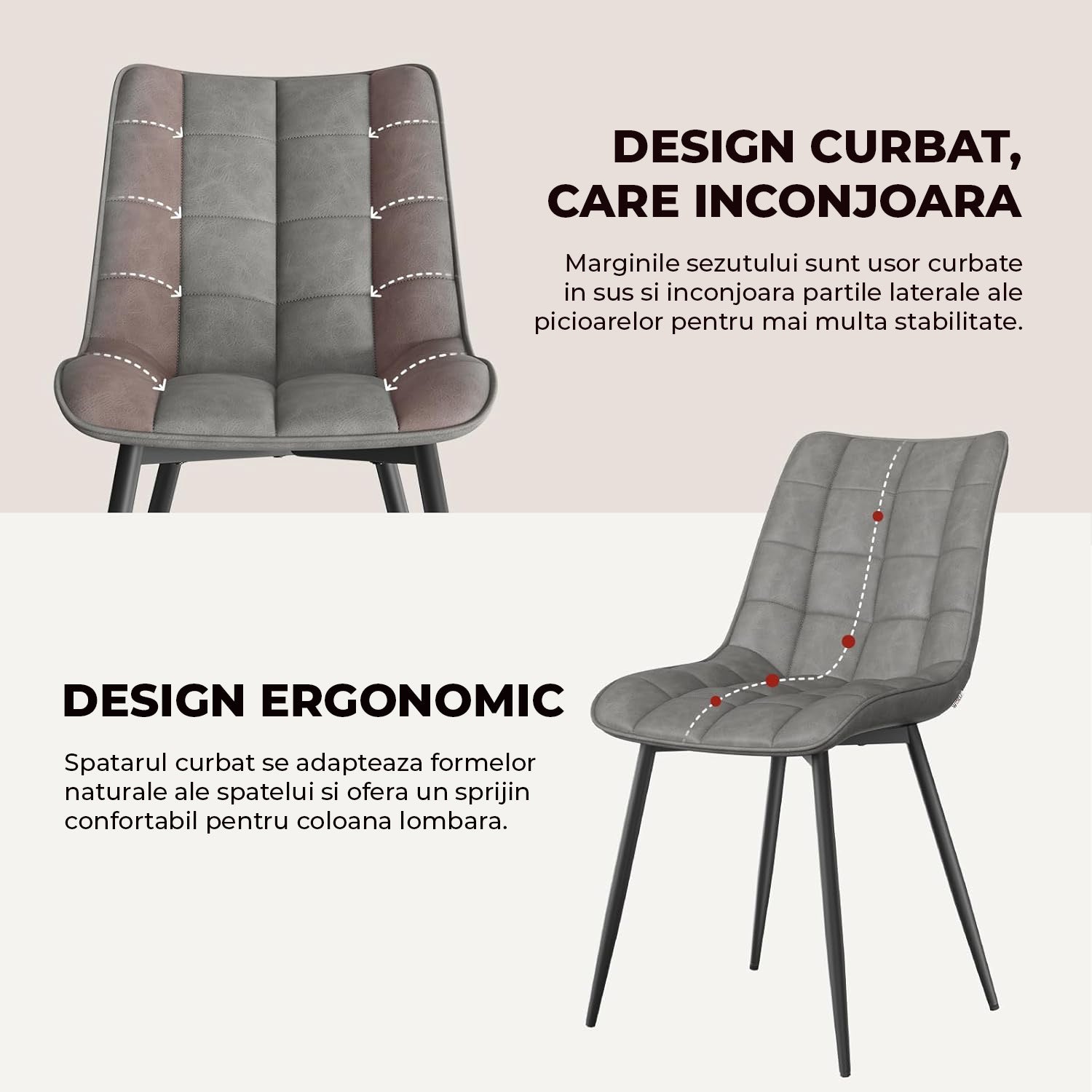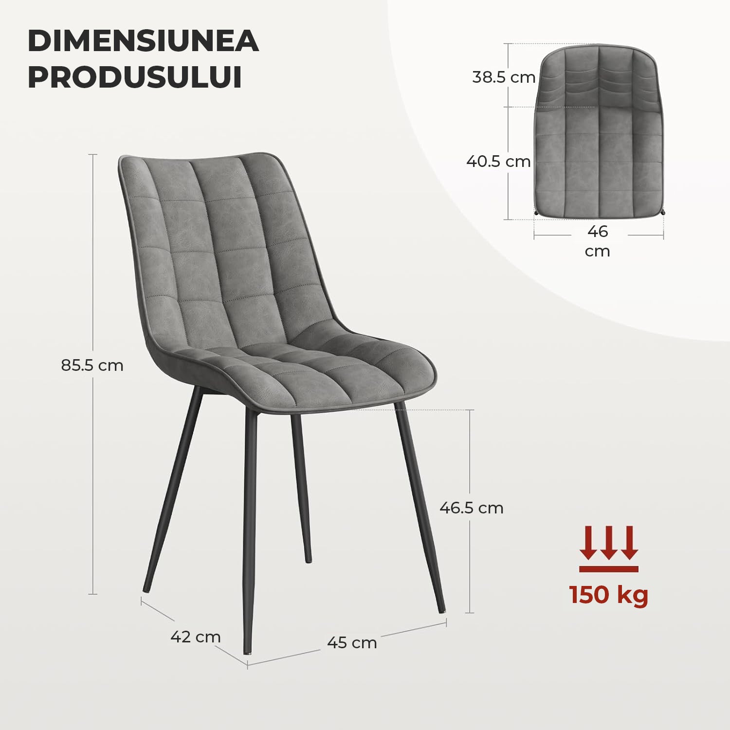 Scaunele sunt tapițate cu catifea moale și respirabilă, umplute cu burete de înaltă densitate și susținute de picioare metalice robuste. Fiecare scaun suportă o greutate de până la 150 kg, garantând rezistență și stabilitate pe termen lung.