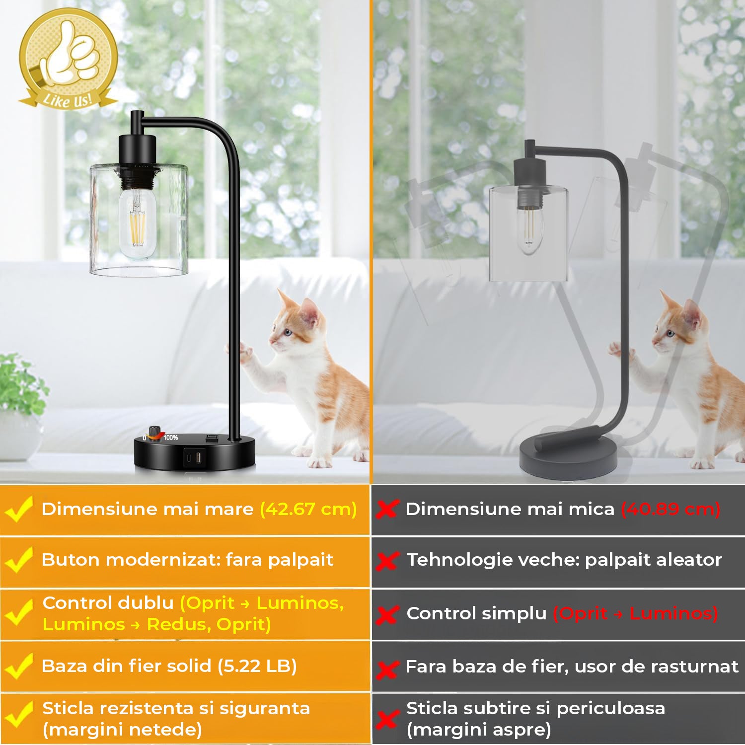 Aceste lămpi de noptieră sunt prevăzute cu întrerupător rotativ cu reglaj continuu, care permite ajustarea luminozității de la intensitate maximă la minimă, inclusiv oprirea directă a lămpii. Spre deosebire de modelele cu atingere, nu este nevoie să treci prin toate modurile pentru a o stinge.