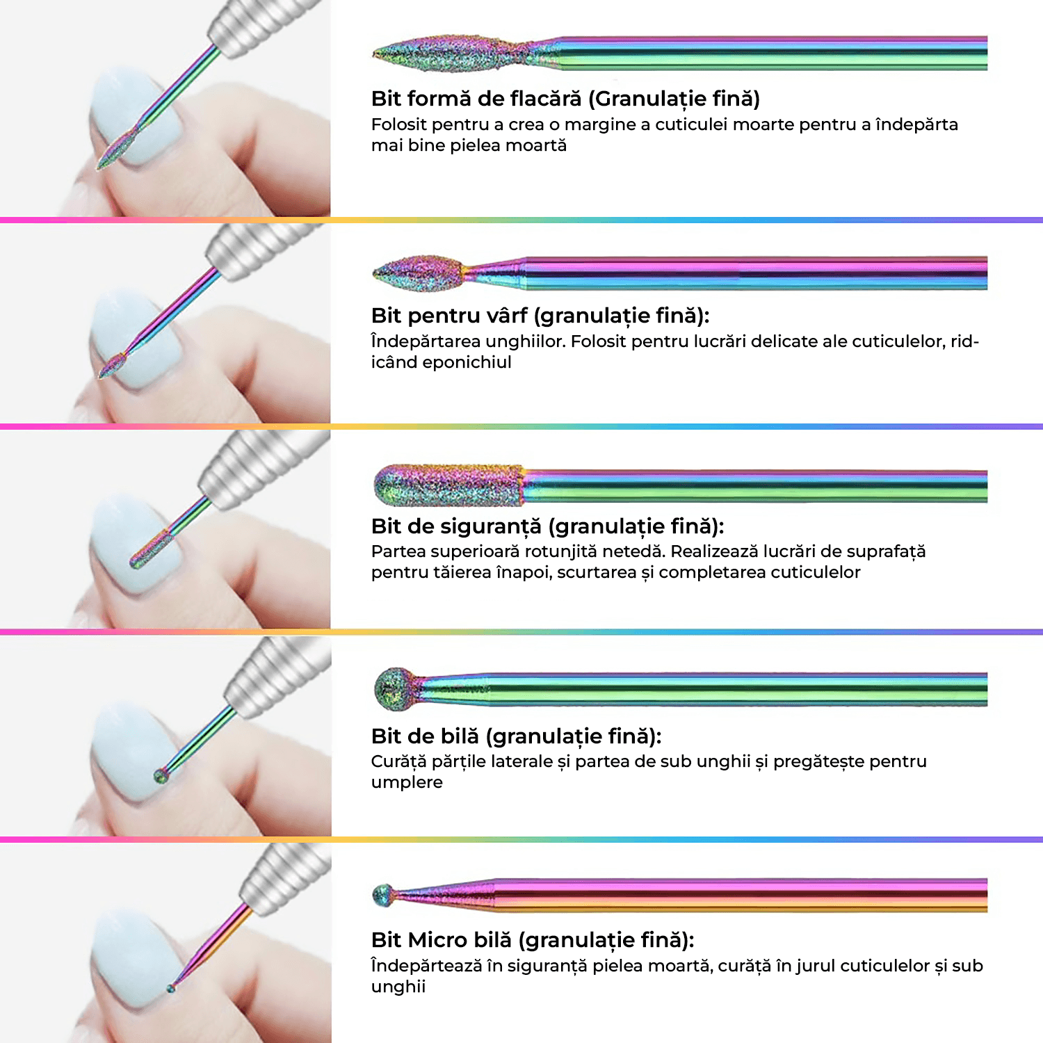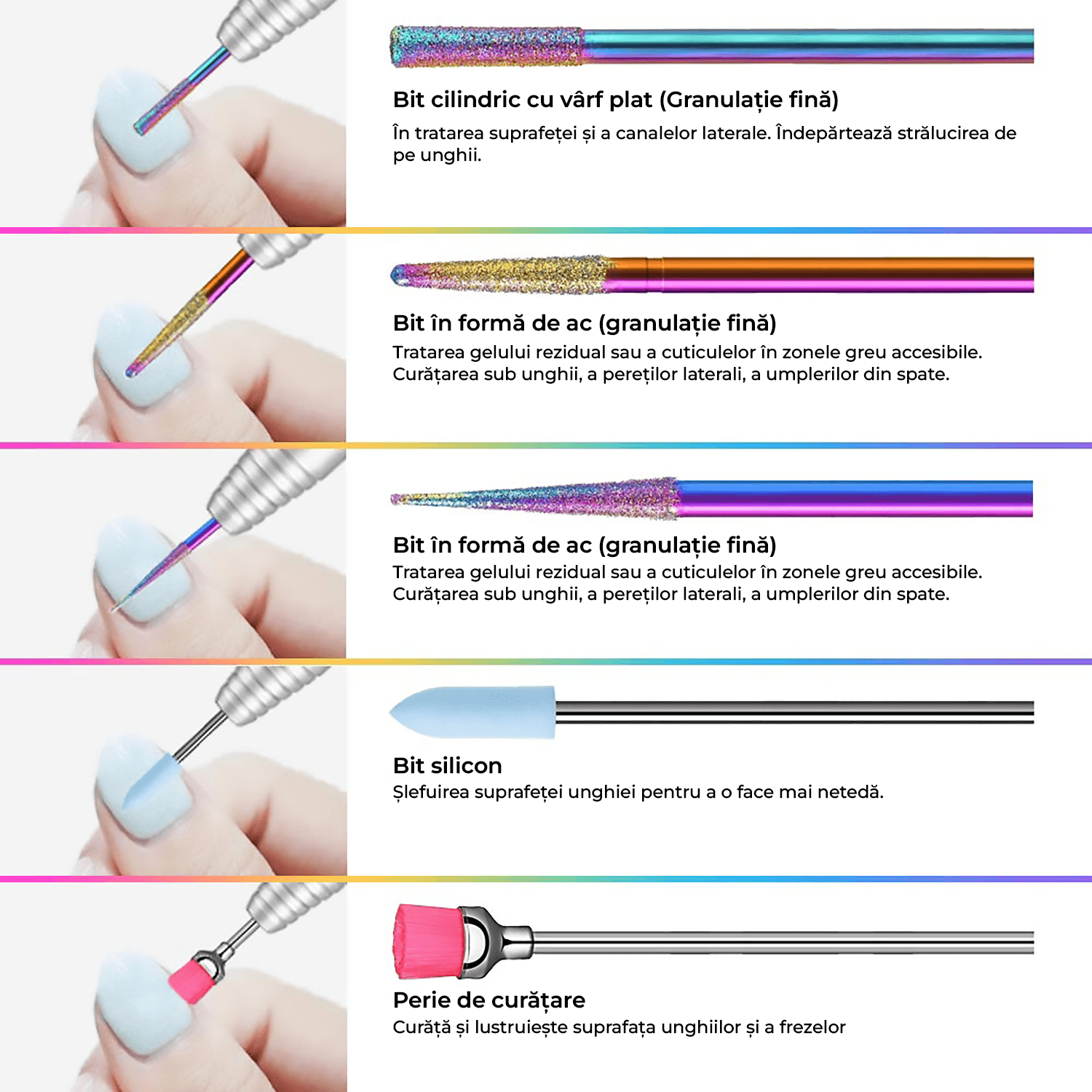 Curatarea cuticulelor: Capetele speciale pentru curatarea cuticulelor va permit sa indepartati delicat si eficient excesul de piele in timpul procesului de manichiura.
