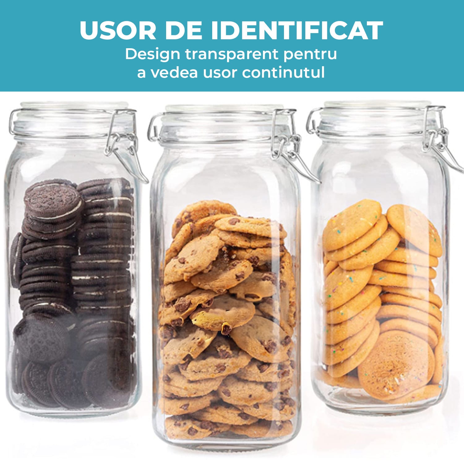Capace Etanșe cu Garnitură din Silicon: Sistemul de închidere cu clemă metalică și garnitură de silicon asigură o etanșeitate perfectă, menținând alimentele uscate și proaspete mai mult timp.