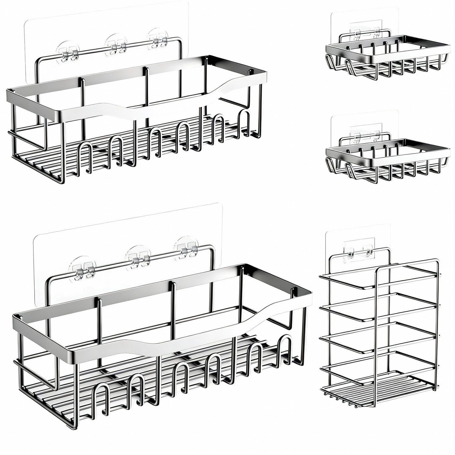 organizator baie inox, raft dus adeziv, suport dus fara gauri, etajera baie inox, caddy dus stainless steel, suport perete baie adeziv, organizare accesorii baie, suport sampoane dus, raft bucatarie adeziv, set organizatoare baie