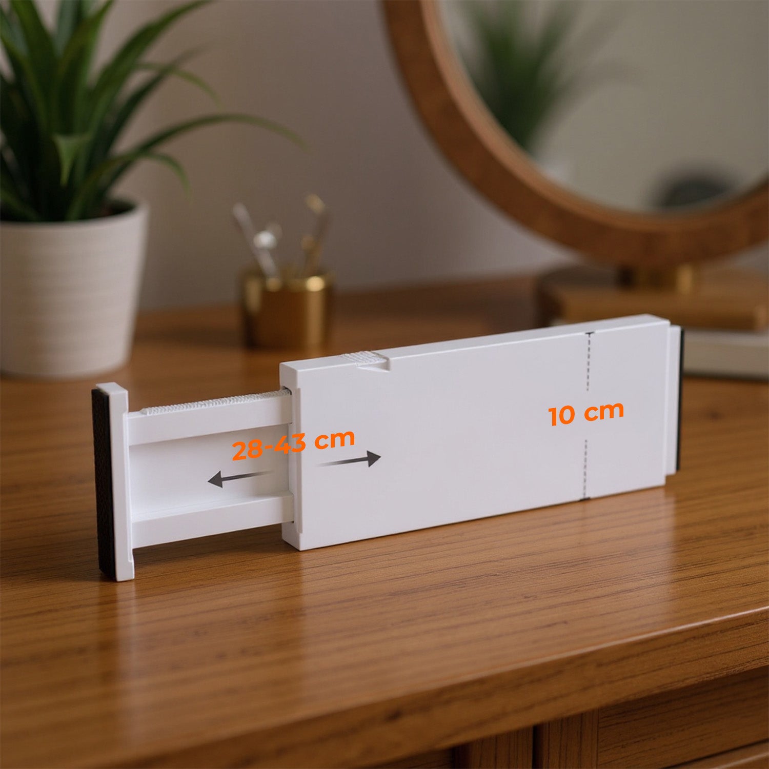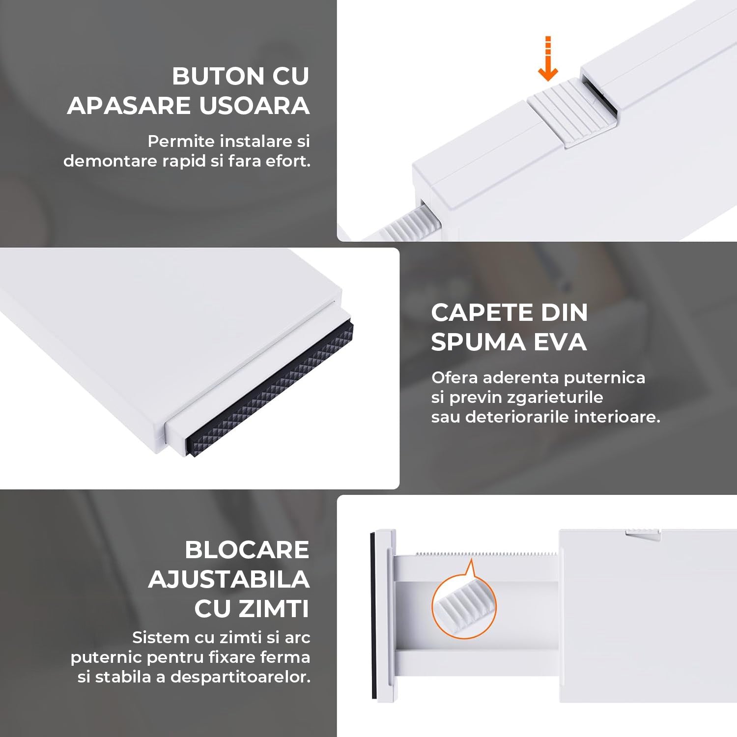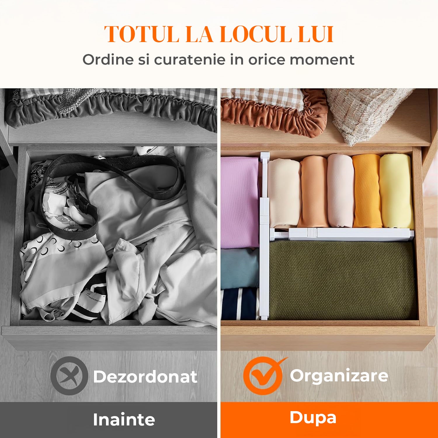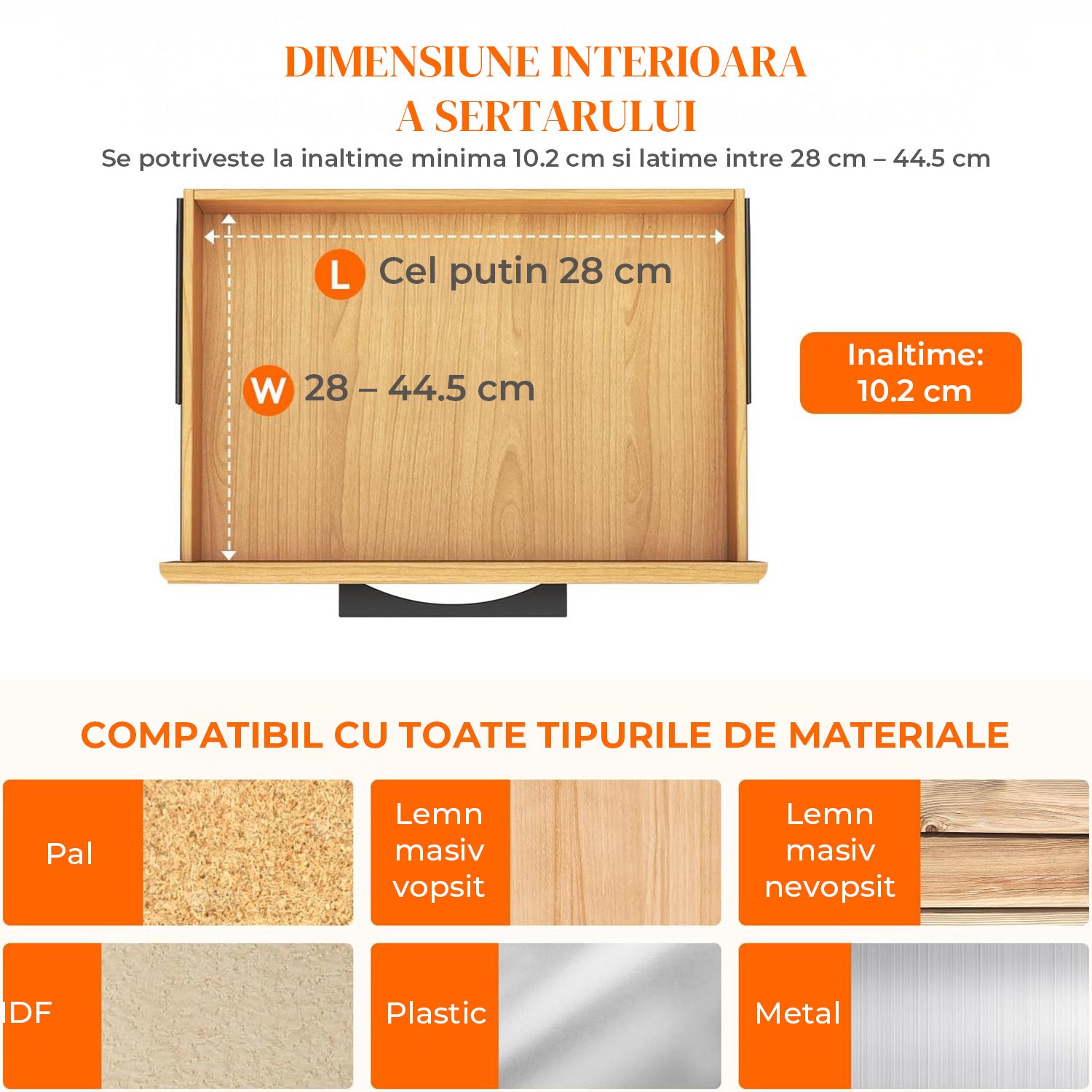 • Dimensiuni reglabile: Lățime 2 cm, înălțime 10 cm, lungime ajustabilă între 28–44,5 cm. Se potrivesc în majoritatea sertarelor și dulapurilor.