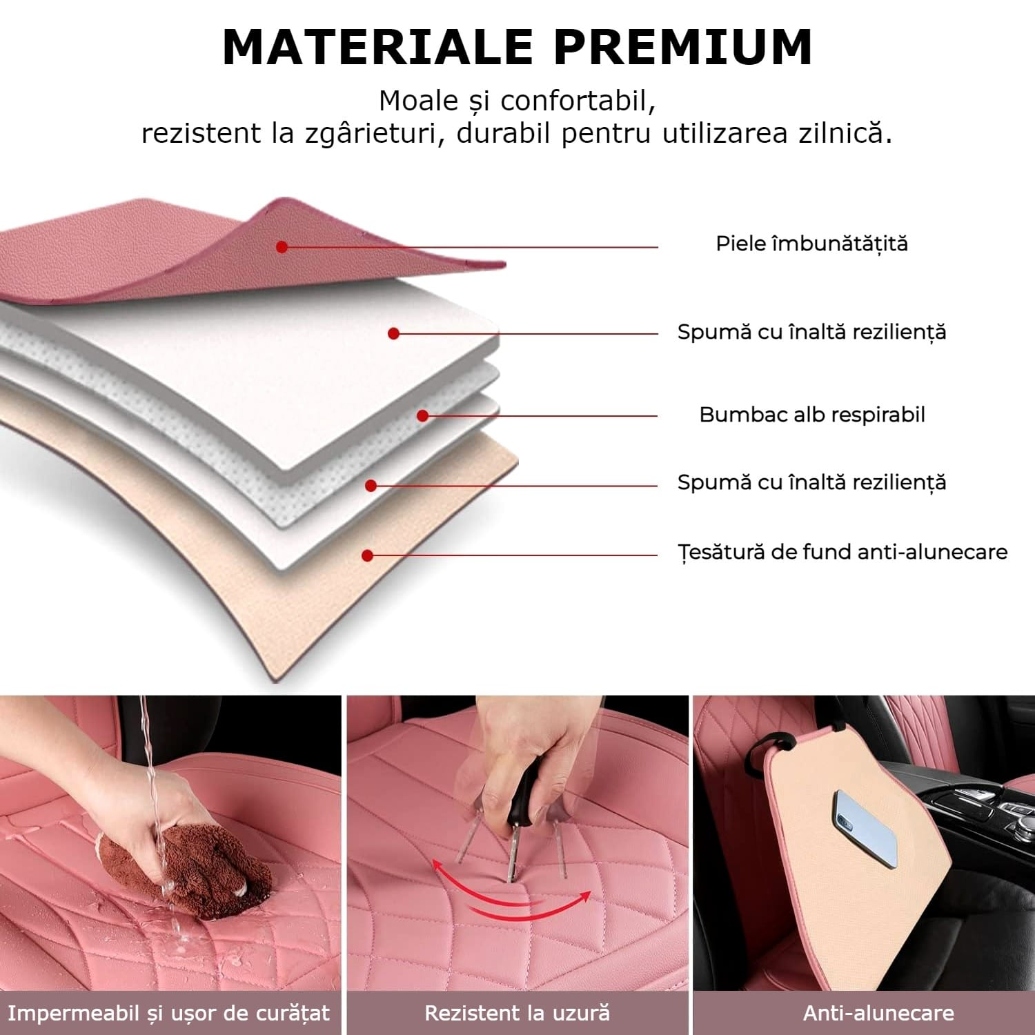 Piele ecologica moale si confortabila: Husele pentru scaune auto din piele PU sunt rezistente la uzura, rezistente la zgarieturi, impermeabile si usor de curatat. Materialul compozit elastic este placut la atingere, oferind rezistenta maxima si confort in timpul calatoriei. Partea inferioara cu spuma antialunecare asigura ca husele pentru scaune raman in loc si nu se deplaseaza in timpul mersului. In plus, curatarea lor este simpla - o stergere cu o carpa umeda este suficienta.