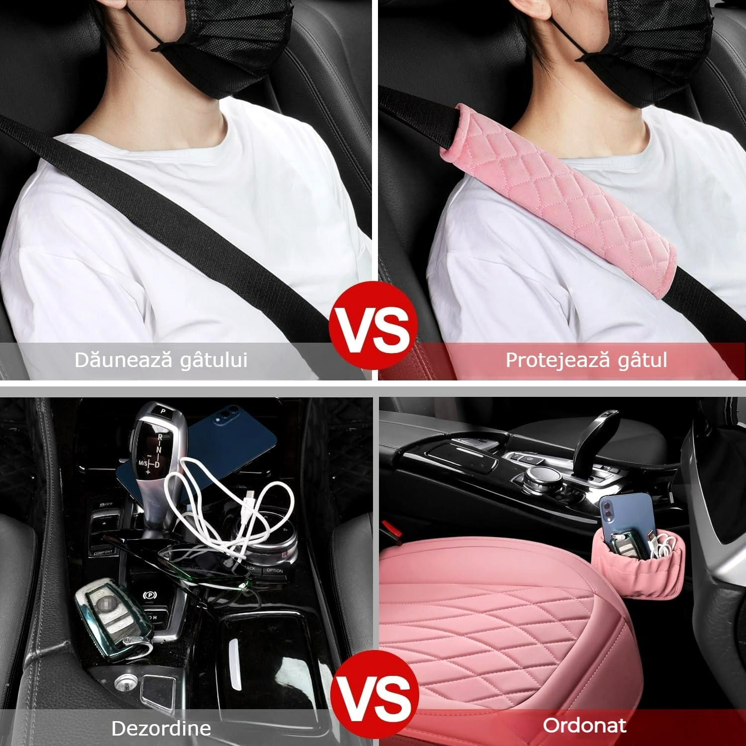 Dimensiune universala: Husele pentru scaune auto se potrivesc in majoritatea autoturismelor. Organizatorul de buzunar pentru masina este compact si poate fi fixat oriunde. Este perfect pentru depozitarea obiectelor mici precum telefoane, ochelari, chei, bani sau cabluri. Pernitele pentru centura de siguranta sunt moi si confortabile, ceea ce face experienta de conducere extrem de placuta.