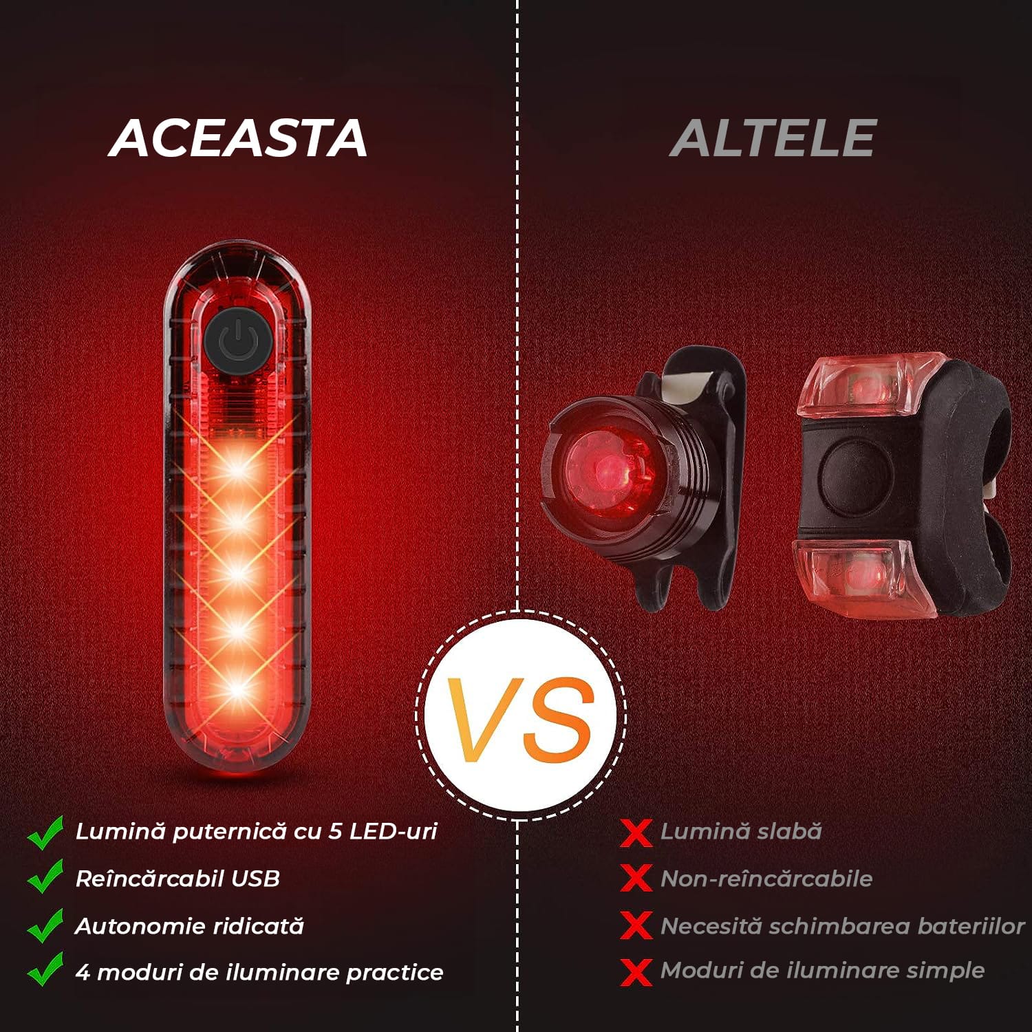 Set 2 Lumini LED Spate Bicicletă, Încărcare USB, 4 Moduri, Impermeabile IPX4, Negru
