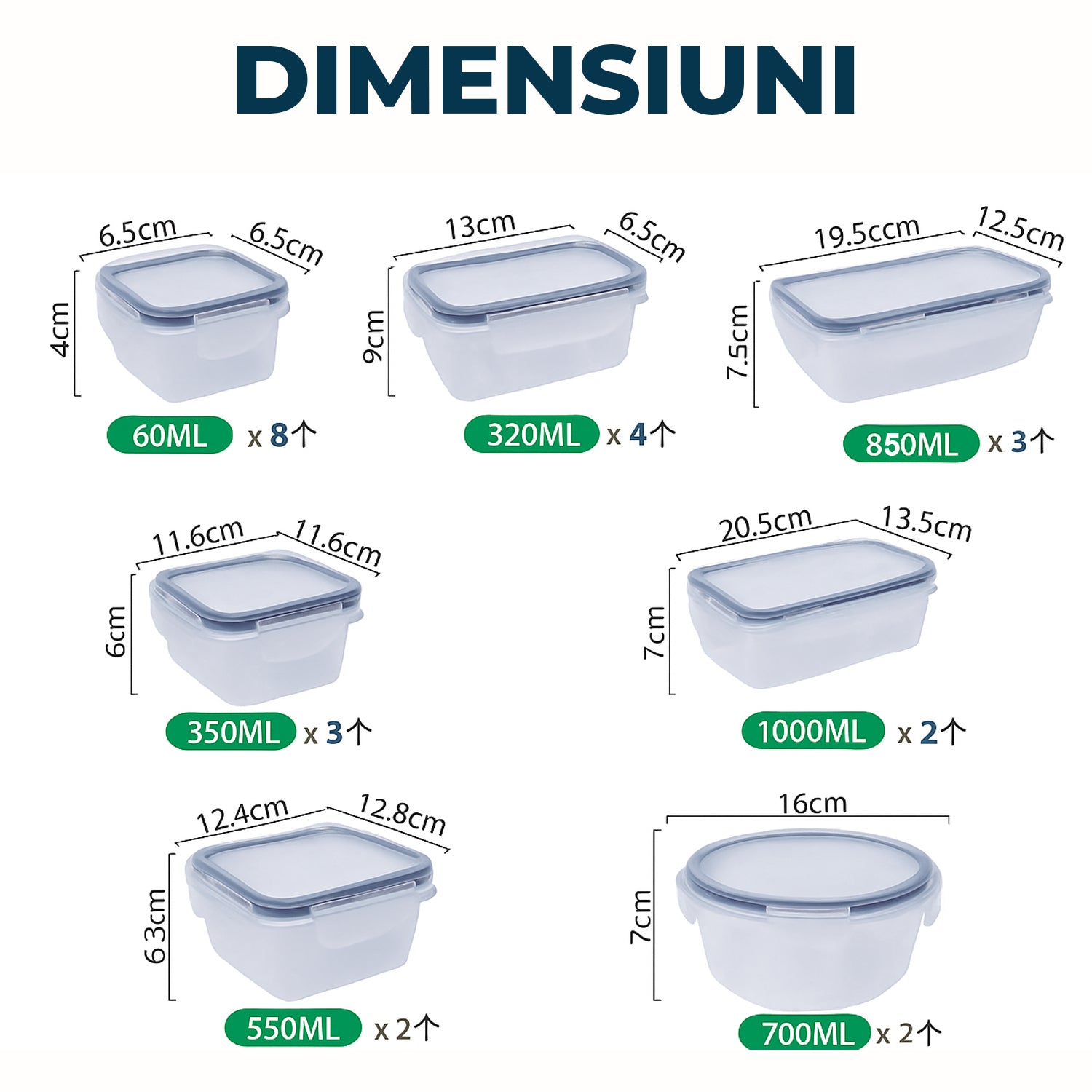 Setul contine caserole de diferite dimensiuni, atat rectangulare, cat si rotunde, precum si pahare pentru dressing, oferindu-ti flexibilitate maxima in organizare.