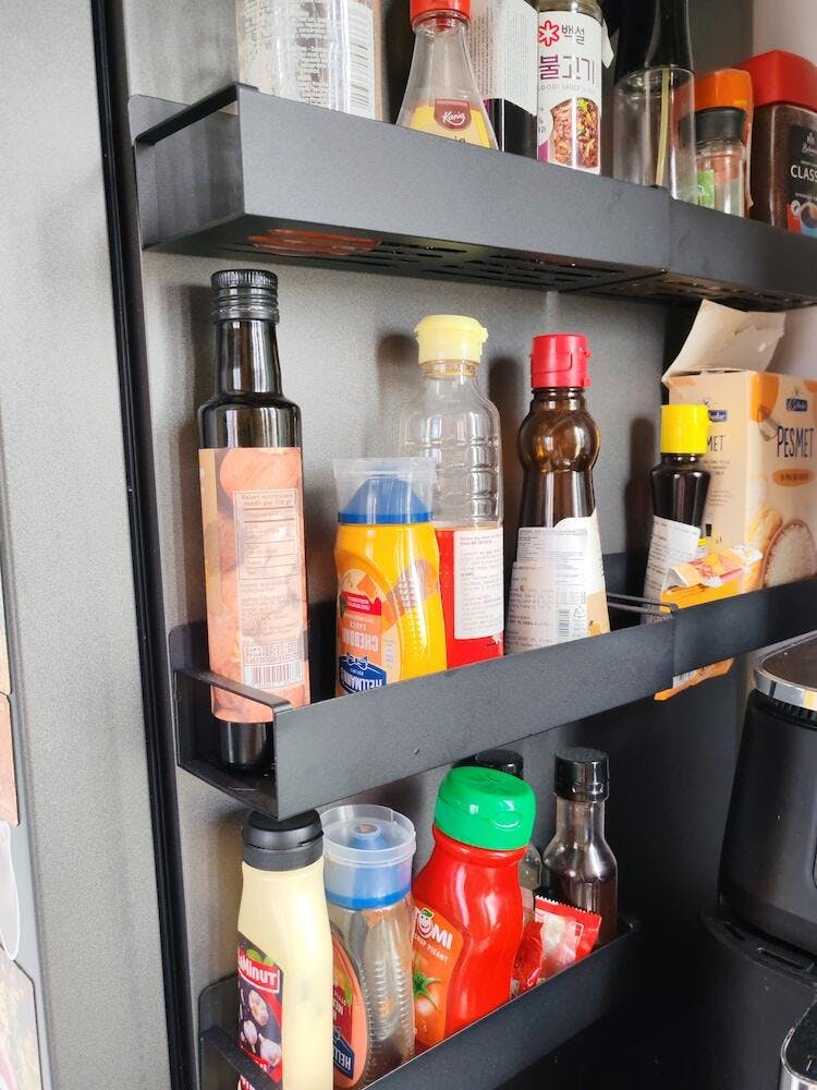 Rafturi Magnetice de Înaltă Calitate pentru Condimente: Raftul magnetic pentru frigider este realizat din oțel carbon de înaltă rezistență, gros și nediformabil. Finisajul negru mat, cu suprafață vopsită, este impermeabil, rezistent la rugină, robust și frumos. Raftul magnetic pentru condimente este cu siguranță un economisitor de spațiu uimitor, eliberând spațiul din dulapul sau blatul bucătăriei și menținându-ți bucătăria organizată și ordonată.