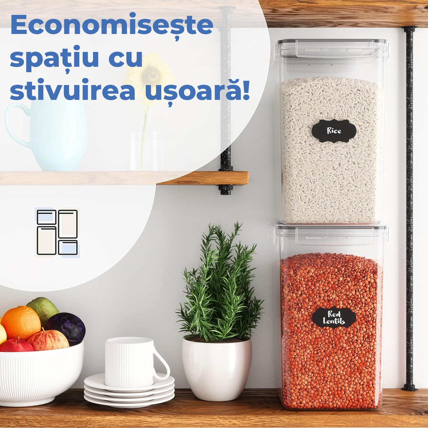 Versatilitate: Recipientele sunt potrivite pentru o gama variata de alimente uscate, precum faina, zahar brun, orez, cereale, fasole, gustari, paste, cafea etc.