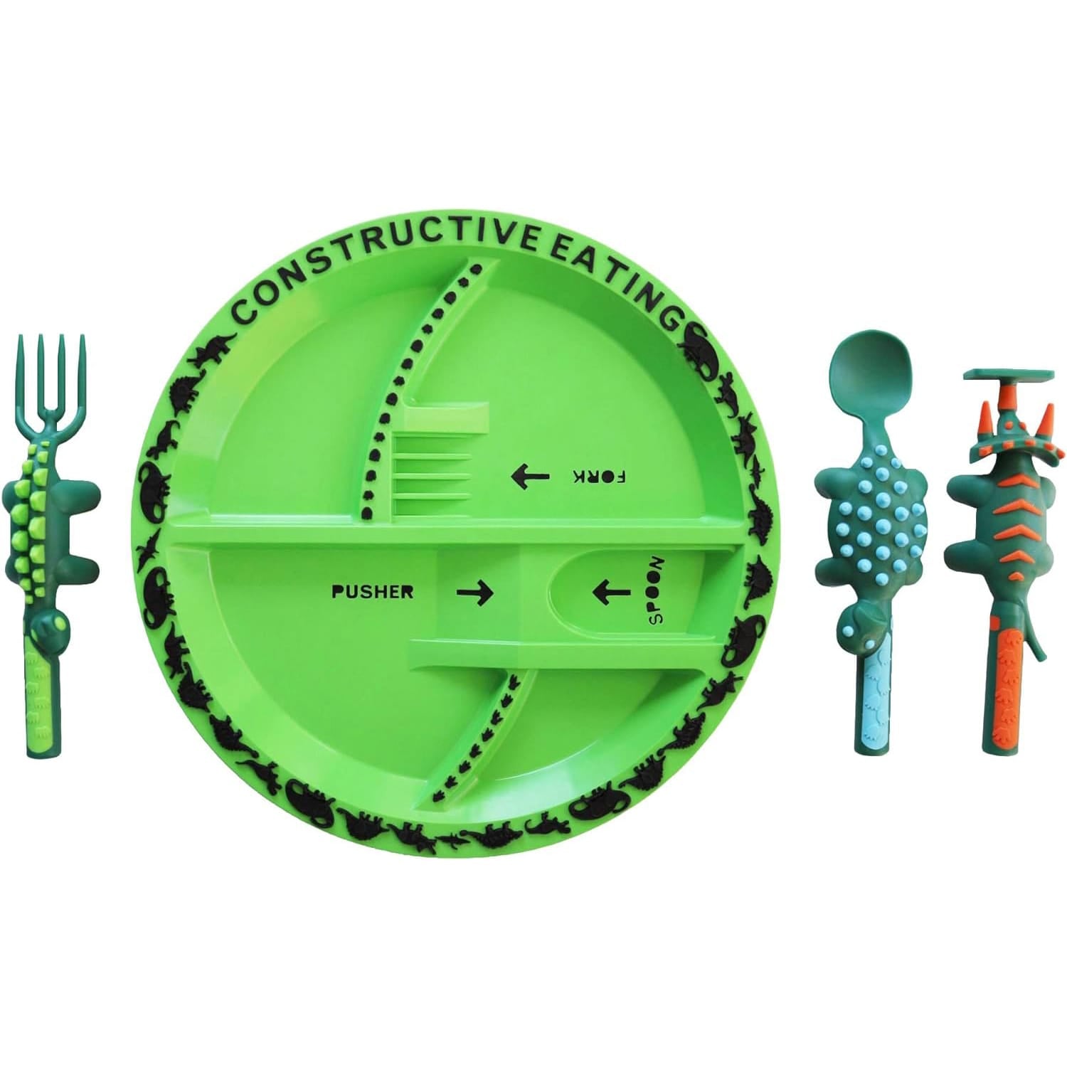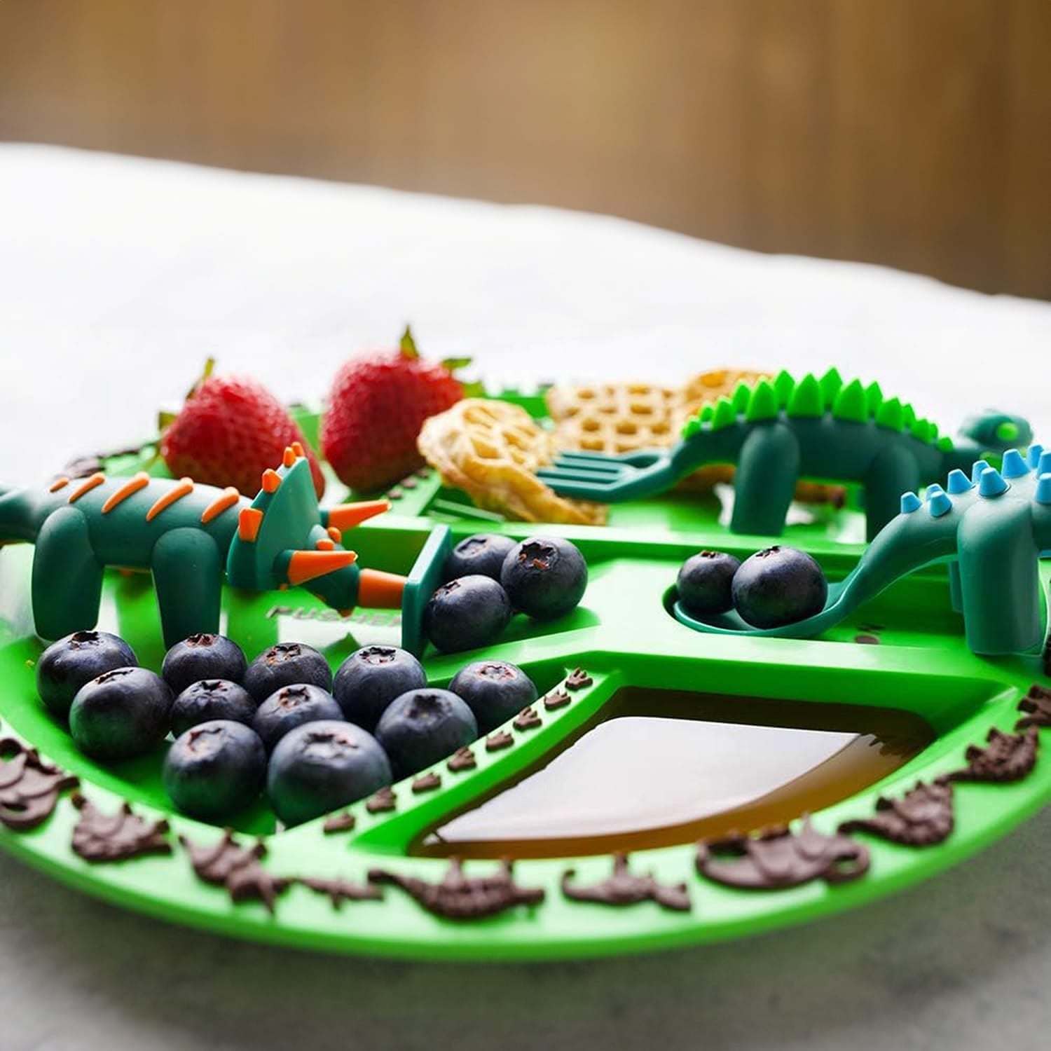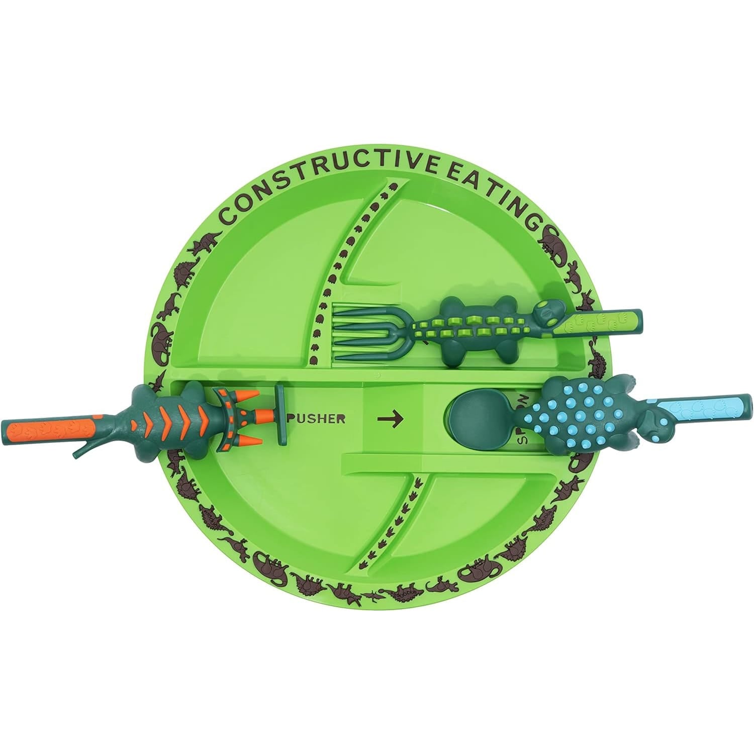 Set masă și tacâmuri copii Elindor® – Farfurie cu 5 compartimente, furculiță și linguriță, 4 piese, Dinozauri