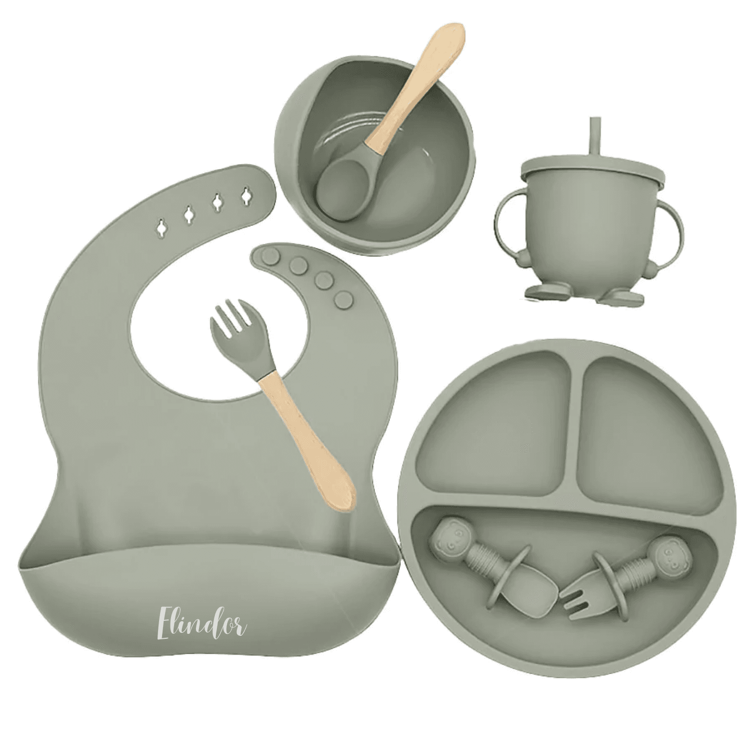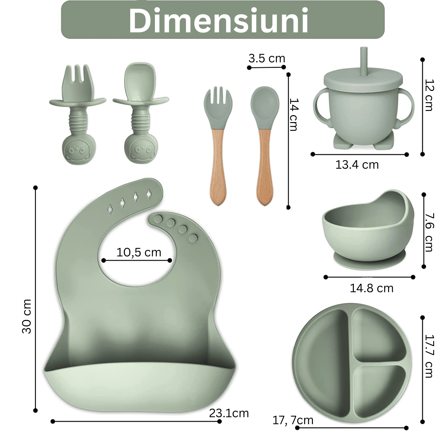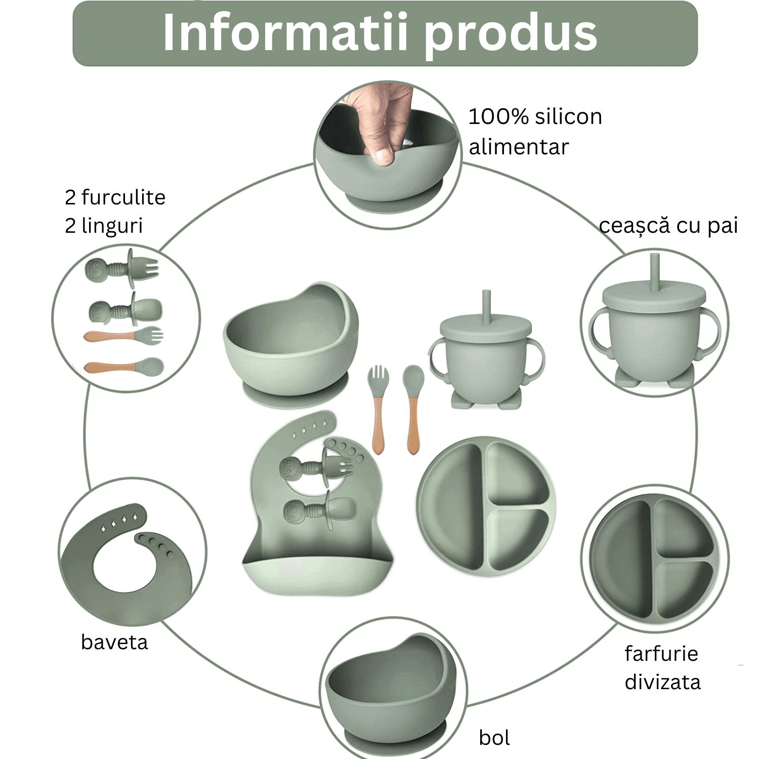 Set hrănire bebe din silicon, 8 piese: bavetă, farfurie compartimentată, bol cu ventuză, 2 seturi linguriță și furculiță, cană, fără alergeni, verde