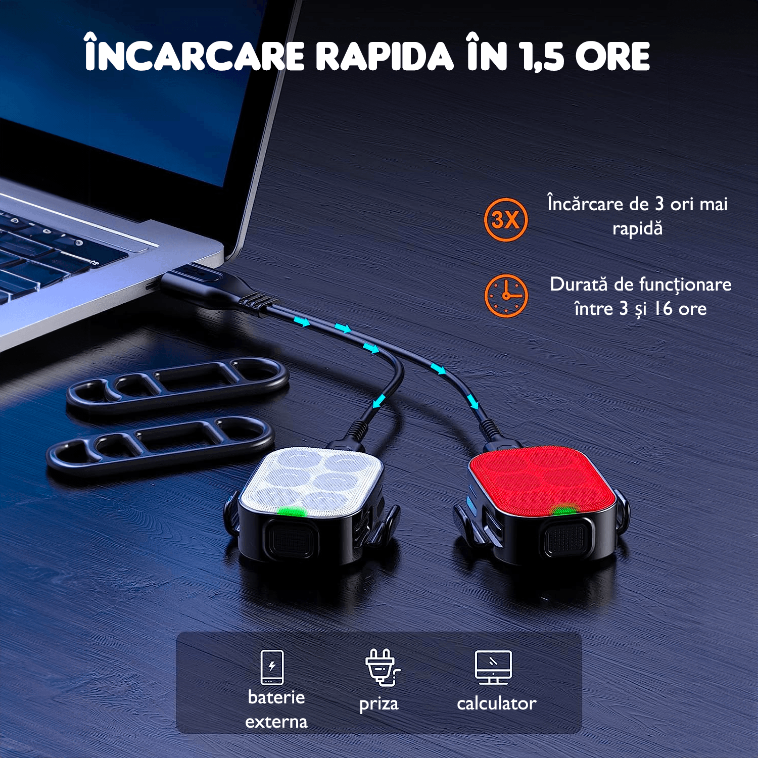Set Lumini Bicicletă 6 LED-uri, Far Față/Spate, USB Reîncărcabil 500mAh, 4 Moduri, IPX65, Ultra Subțire, Alb/Rosu