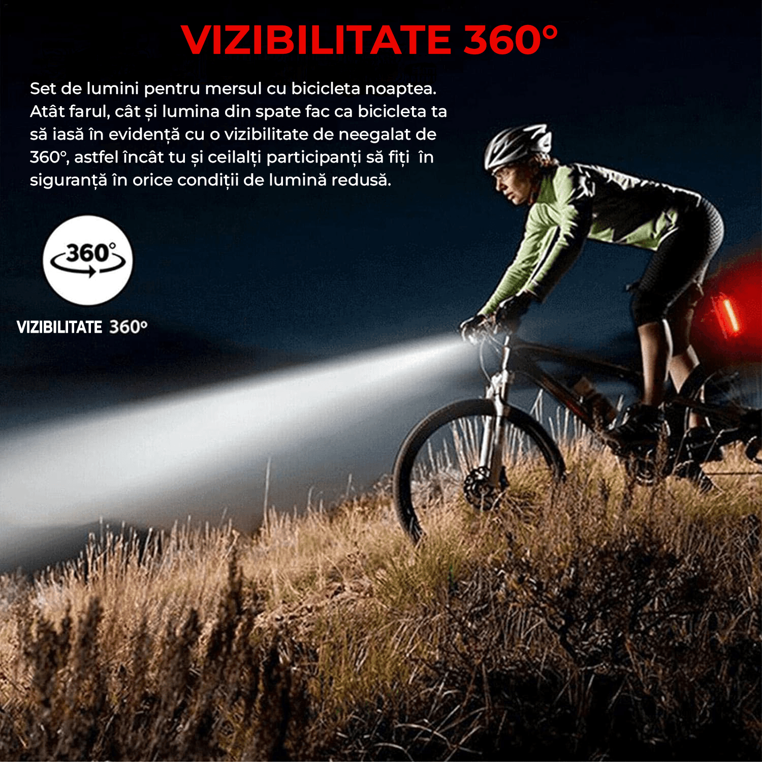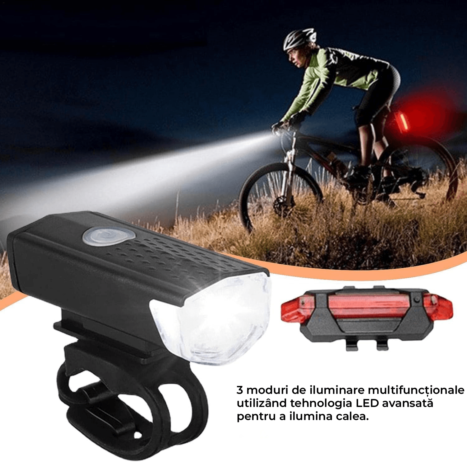 Perfecta pentru ciclismul nocturn: Lumina frontala si spate pentru bicicleta elimina problemele de siguranta in timpul calatoriilor nocturne.