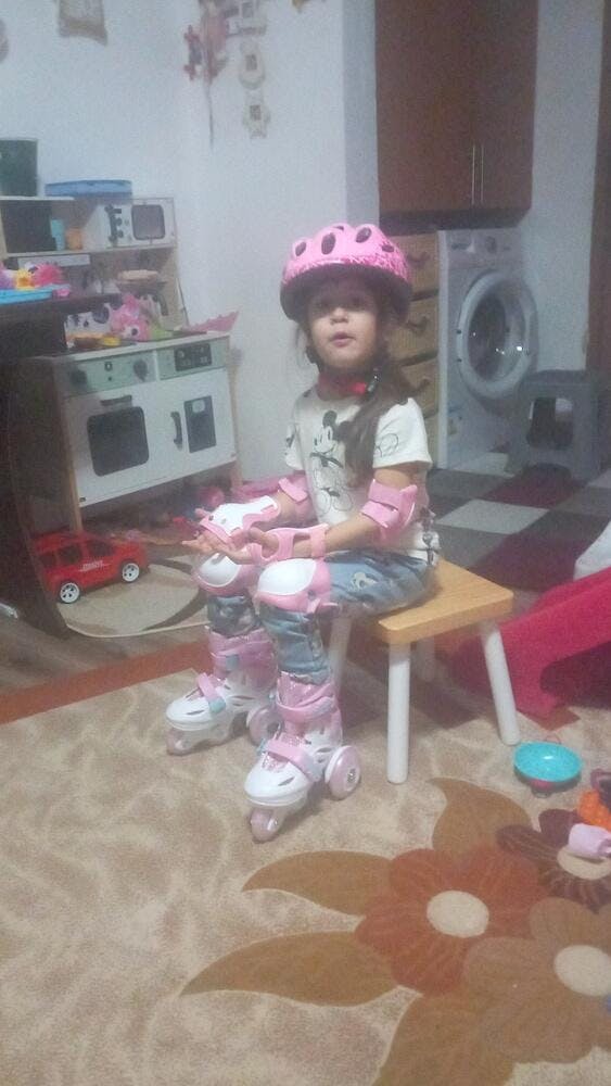 Set Protectie Pentru Copii 7 in 1, Casca cu Marime Reglabila, Genunchiere, Cotiere si Aparatori Incheieturi, Multicolor, 3-8 ani, Galactic, Marimea S, Roz
