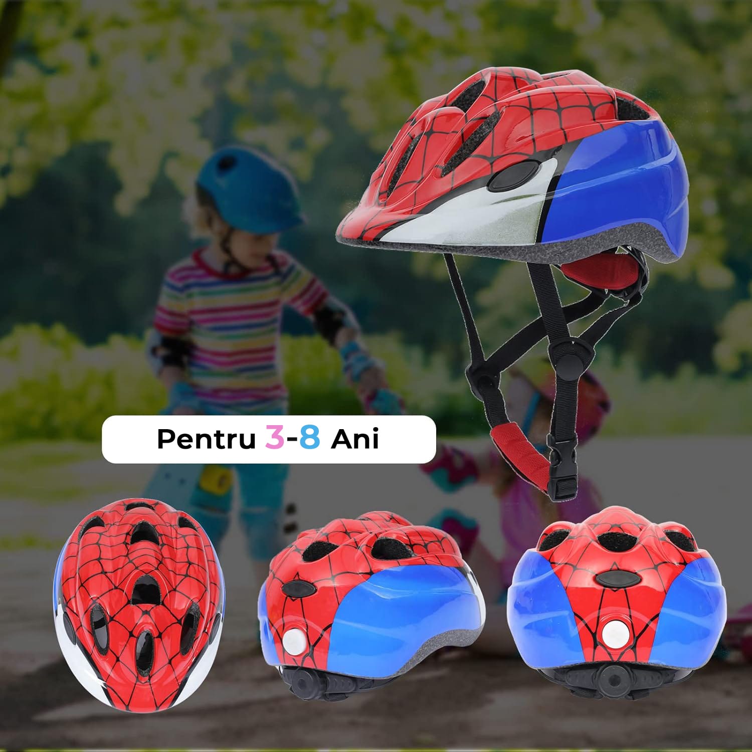 Set Protectie Pentru Copii,Casca cu Marime Reglabila, Genunchiere, Cotiere si Aparatori Incheieturi, Multicolor, 3-8 ani, Marimea XS, Spiderman