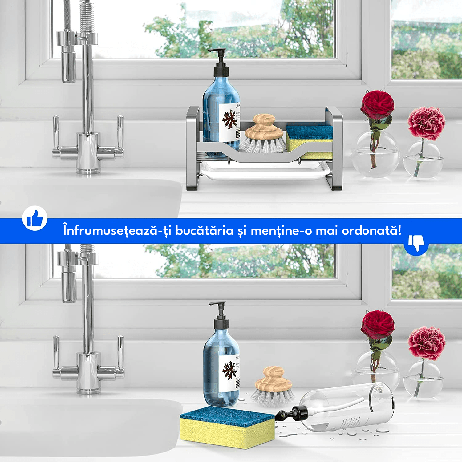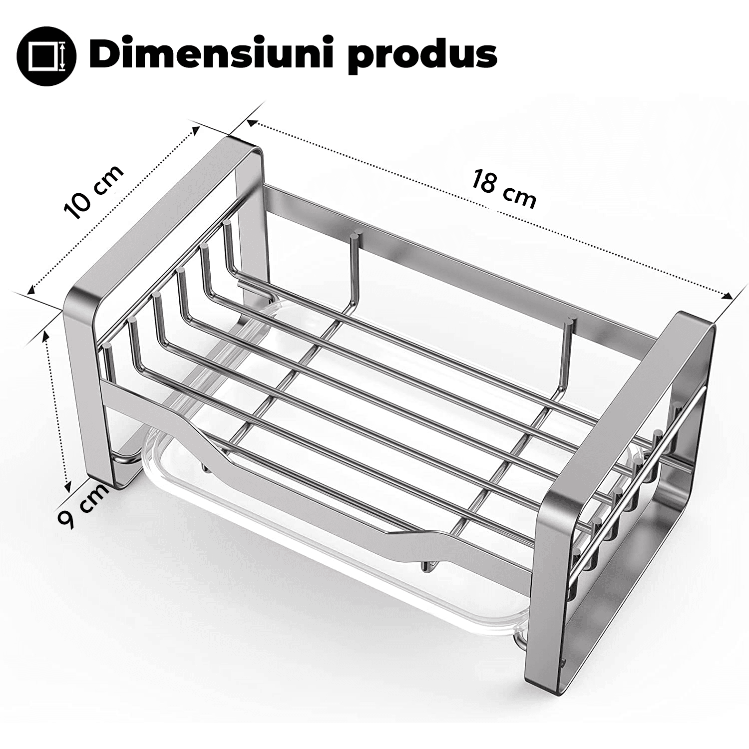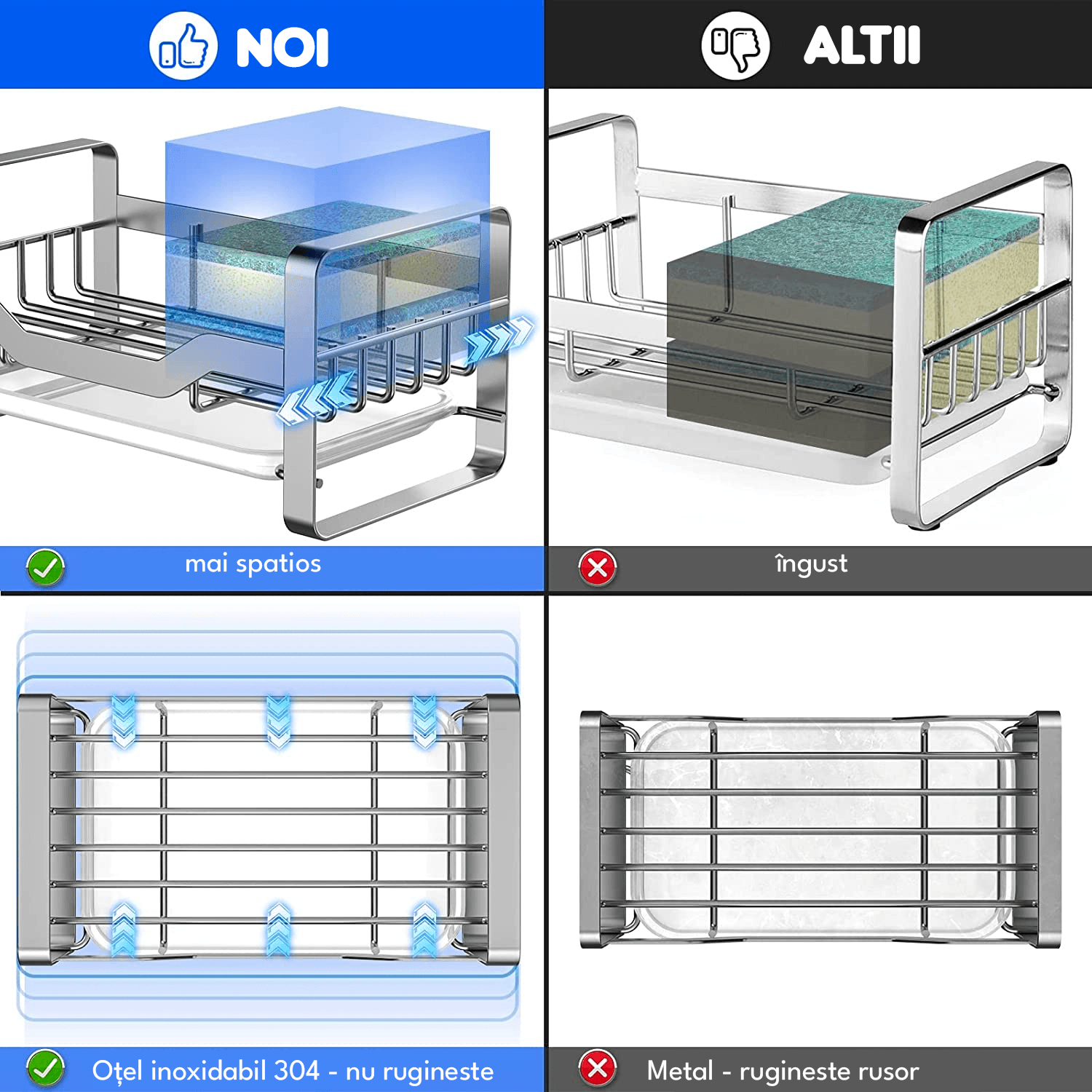 Organizatorul de bucatarie are un cos spatios pentru a depozita buretele, peria, carpa, detergentul si alte produse de curatare pe care trebuie sa le aveti la indemana. Depozitarea buretilor in afara chiuvetei umede este mai igienica, iar buretii nu vor mirosi.