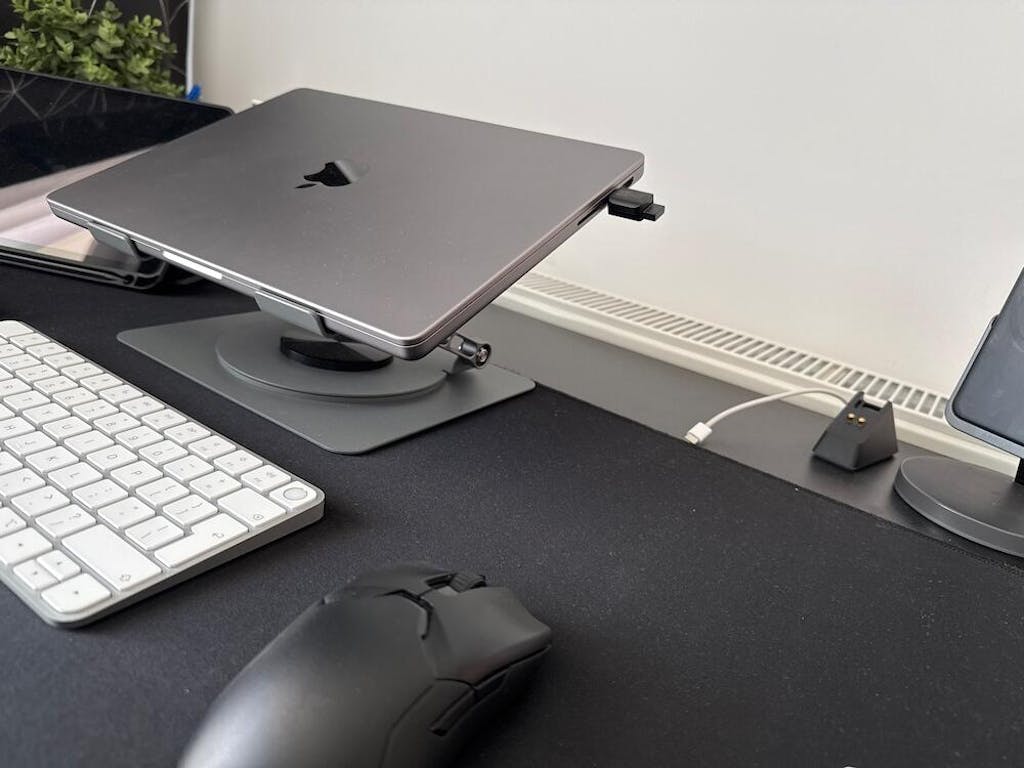 Inaltime si Unghi Reglabile: Suportul ELINDOR ofera o varietate de inaltimi si unghiuri ajustabile, oferindu-va flexibilitate in organizarea spatiului de lucru in functie de nevoile dvs. Inaltime: 2,826 cm, Unghi: 0180° si rotatie de 360°.