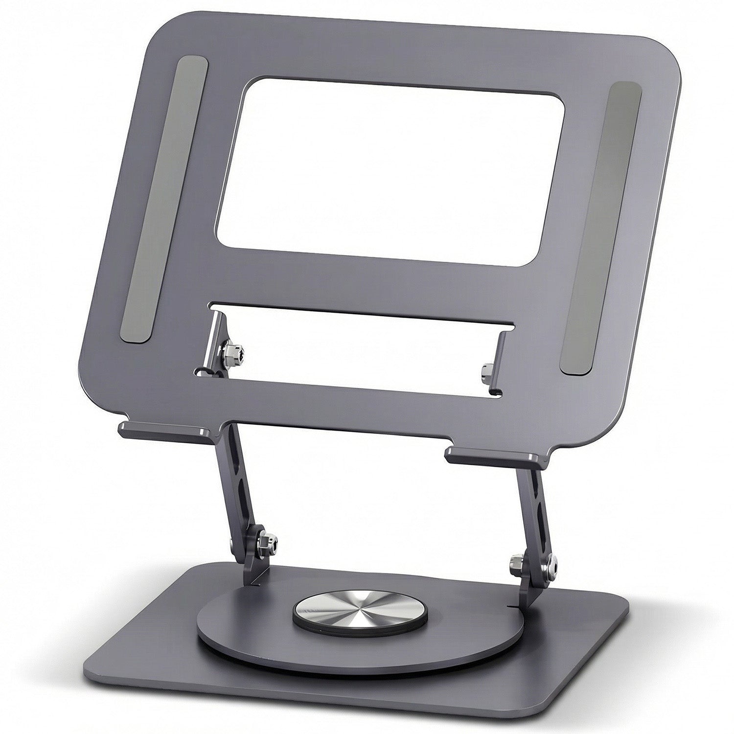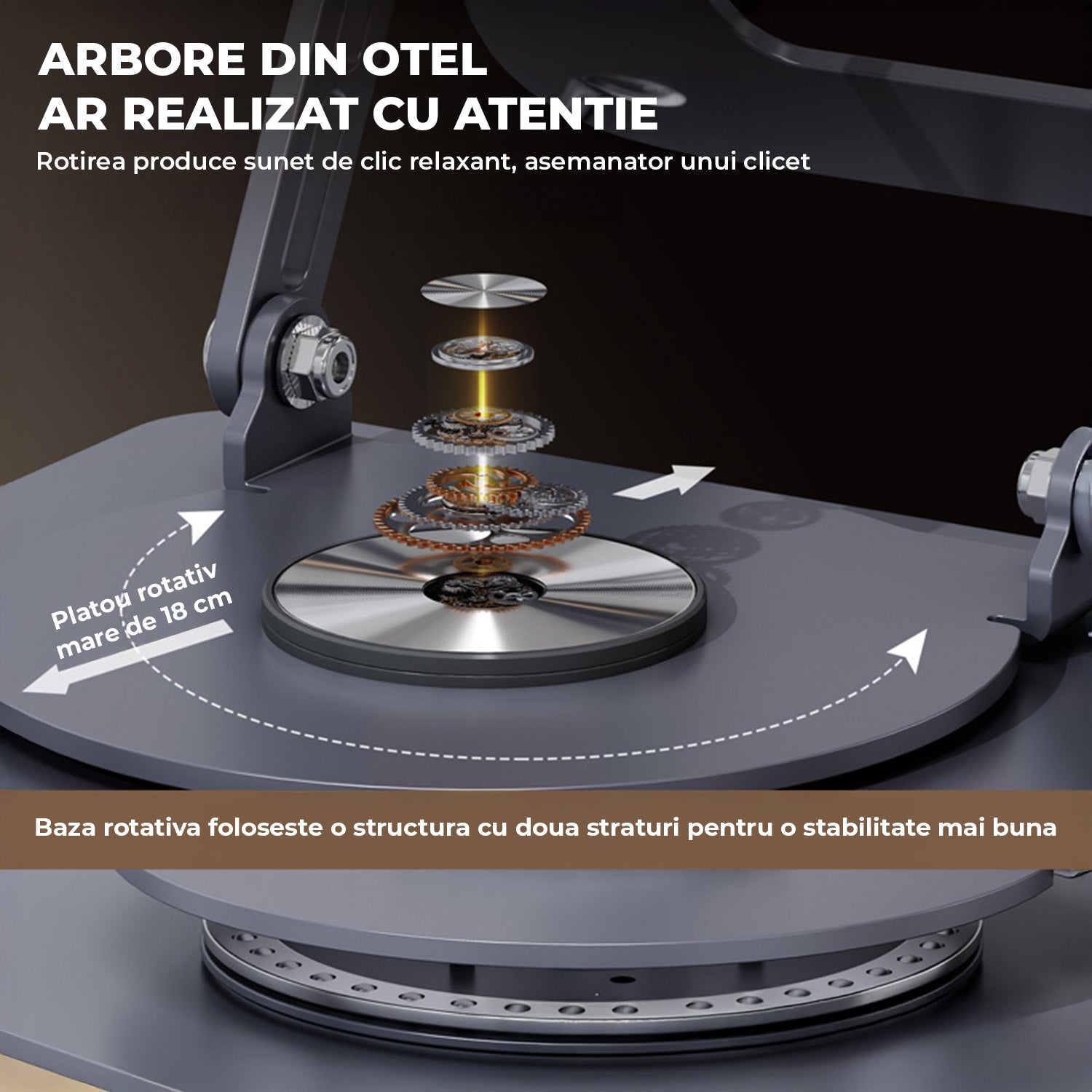 Baza rotativa 360° si axele reglabile iti permit sa ajustezi rapid unghiul de vizualizare – ideal pentru apeluri video, prezentari sau multitasking. Fabricat din aliaj metalic rezistent, cu o baza antiderapanta din silicon, ofera stabilitate exceptionala chiar si in timpul tastarii intense.
