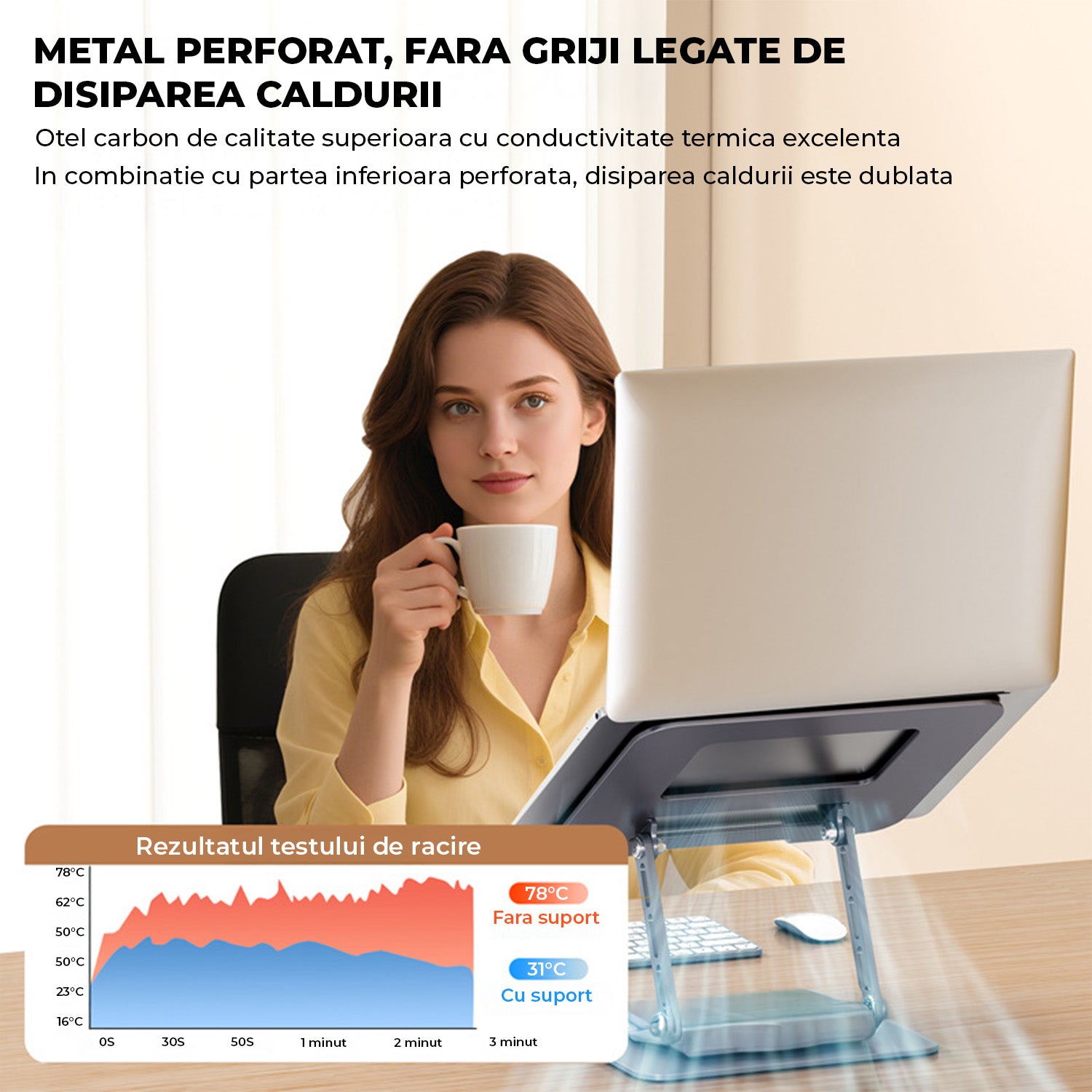 Designul perforat favorizeaza racirea laptopului, eliminand riscul de supraincalzire si mentinand performanta optima a dispozitivului tau. Complet pliabil si usor de transportat, devine companionul perfect pentru birou, acasa sau in calatorii.
