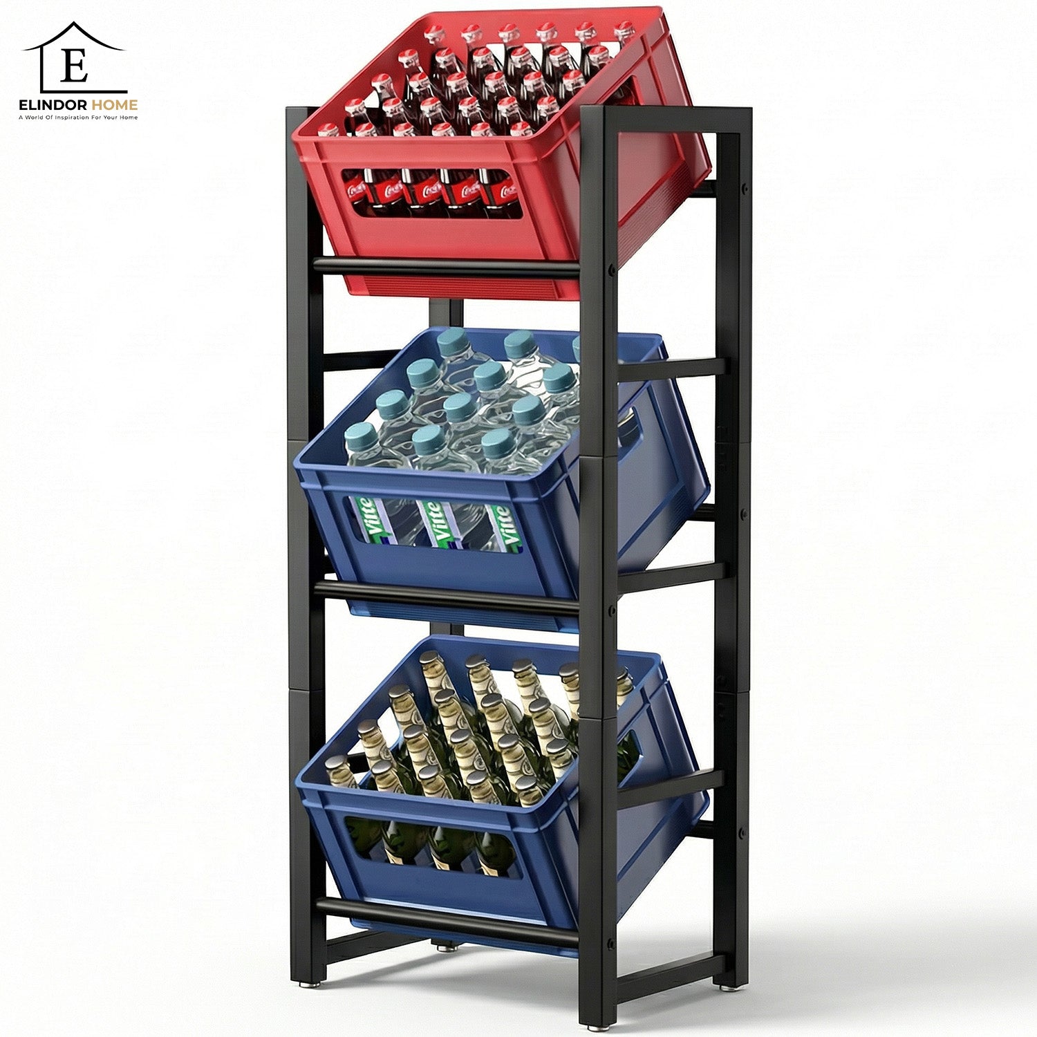 Acest Suport Navete Bauturi Elindor® combina rezistenta metalica, stabilitatea reglabila si designul compact, oferind o solutie practica pentru depozitarea organizata a bauturilor in orice spatiu.