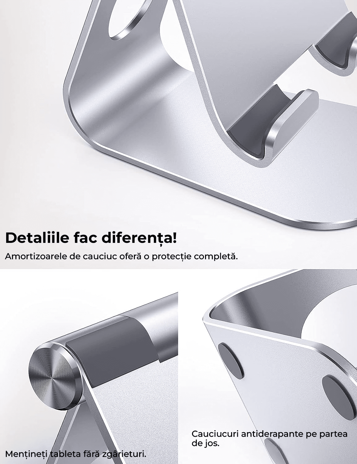 Aspect Elegant si ModernCu o culoare argintie atragatoare, suportul pentru tableta adauga un aspect elegant si modern spatiului dvs. de lucru sau zonei de relaxare.