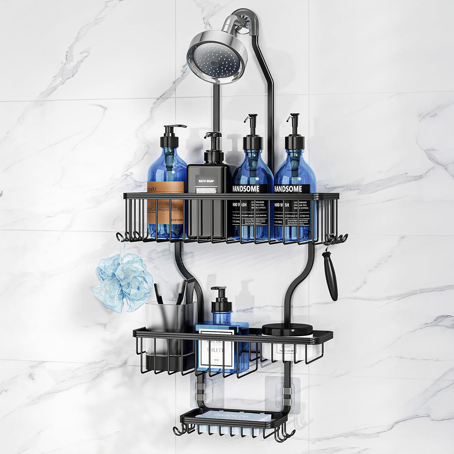 Organizatorul suspendat pentru dus Elindor vine echipat cu 3 cosuri incapatoare si 10 carlige multifunctionale. Cele 2 cosuri superioare sunt ideale pentru depozitarea gelului de dus, samponului si lotiunilor, in timp ce cosul inferior este special creat pentru sapun. Cele 10 carlige sunt perfecte pentru agatarea aparatelor de ras, buretilor de baie, periutelor de dinti si prosoapelor. Acest organizator optimizeaza spatiul din dusul tau, pastrand produsele de igiena ordonate si la indemana. Dimensiuni: 33×12.7×69.8 cm (L×l×h).