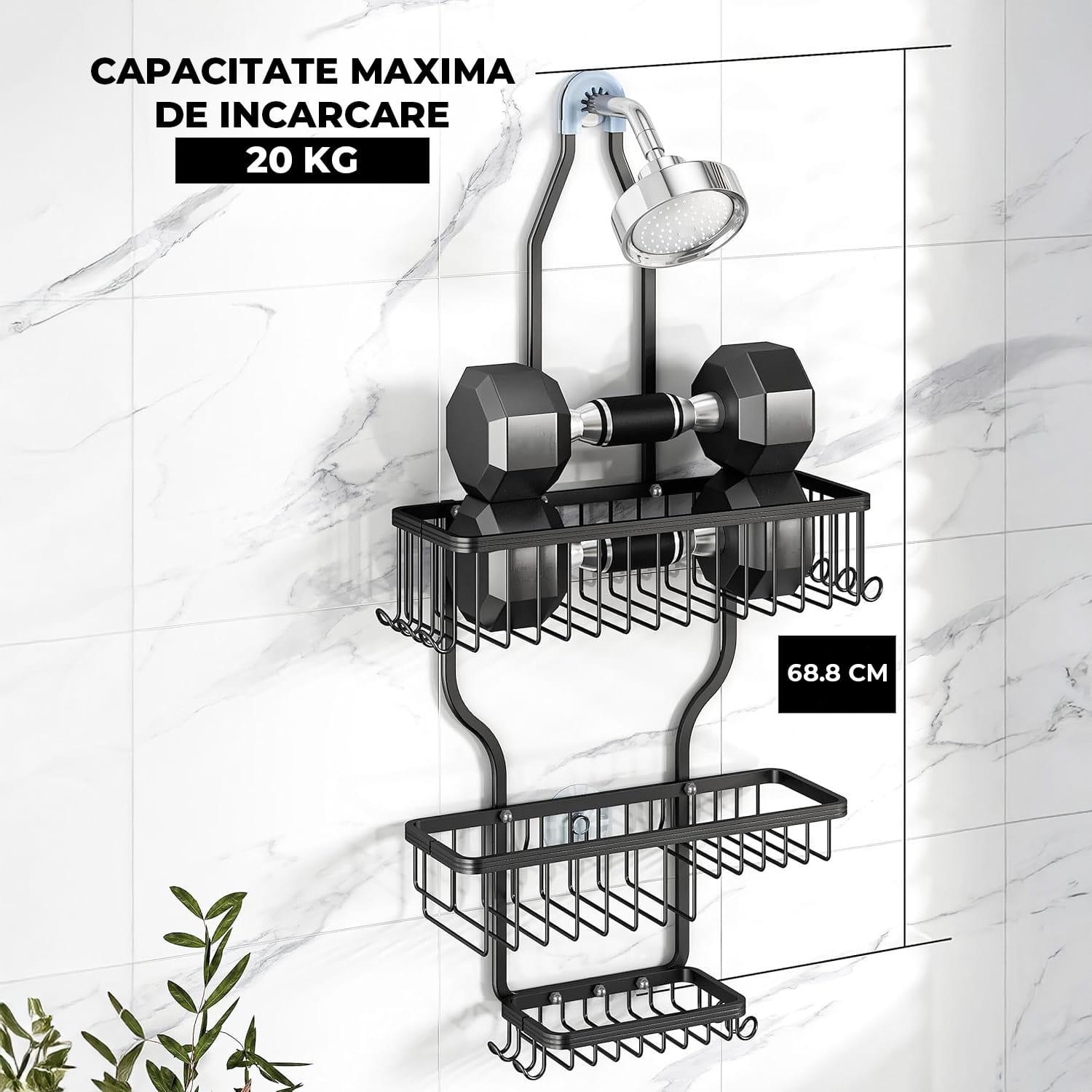 Realizat din aliaj de aluminiu premium, acest organizator este rezistent la rugina, ideal pentru medii umede precum baia. Cu o duritate a suprafetei de 200-300 HV, este robust si durabil, sustinand pana la 20 kg de produse de igiena. Totodata, materialul sau usor reduce presiunea asupra capului de dus, fiind o solutie practica si eficienta.